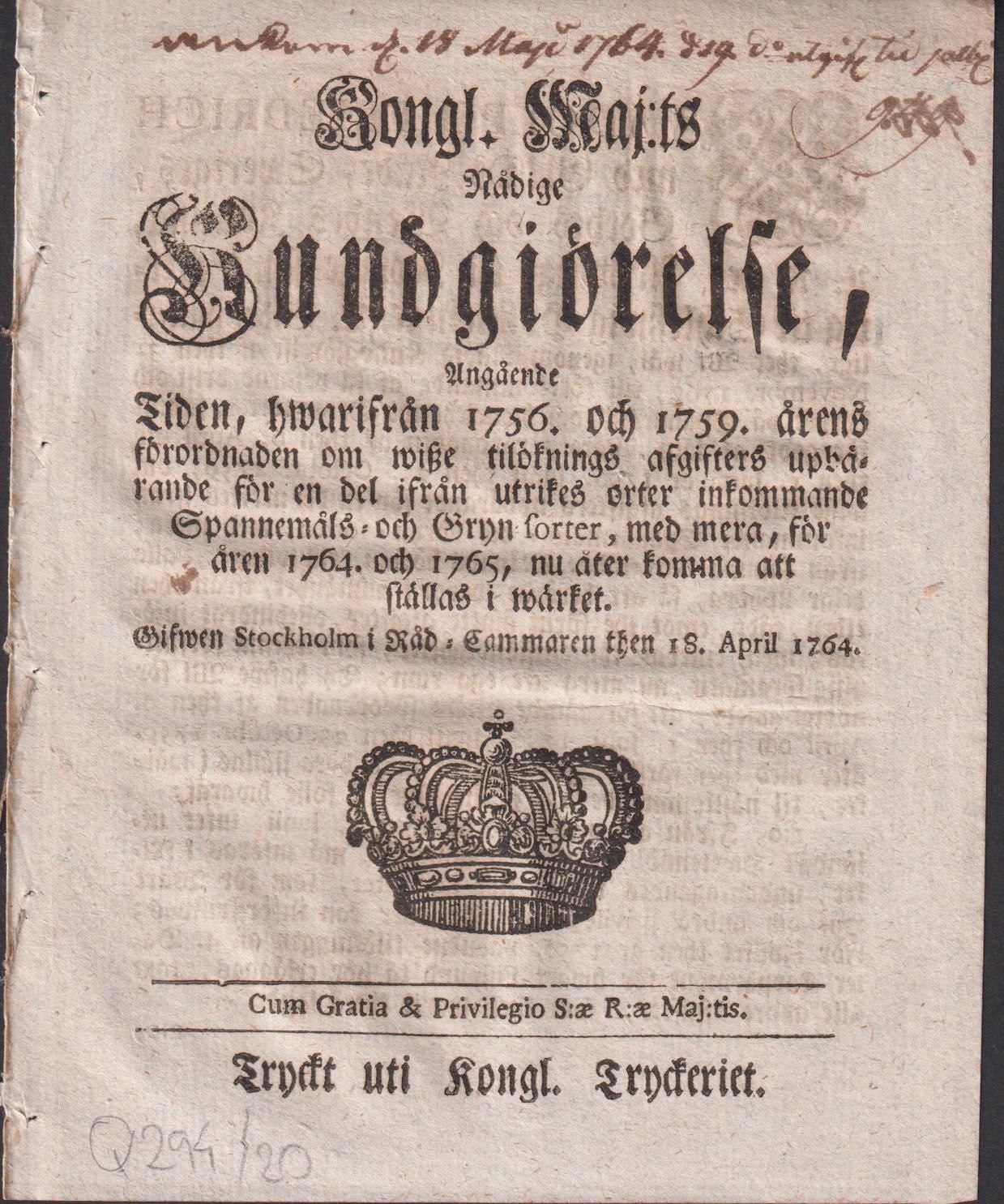 Kongl. maj:ts nådige Kundgiörelse, Angående Tiden, hwarifrån 1756. och 1759. årens förordnaden om wisze tilöknings afgifters upbärande för en del ifrån utrikes orter inkommande Spannemåls- och Gryn-sorter, med mera, för åren 1764. och 1765, nu åter komma att ställas i wärket. Gifwen Stockholm i Råd-Cammaren then 18. april 1764.