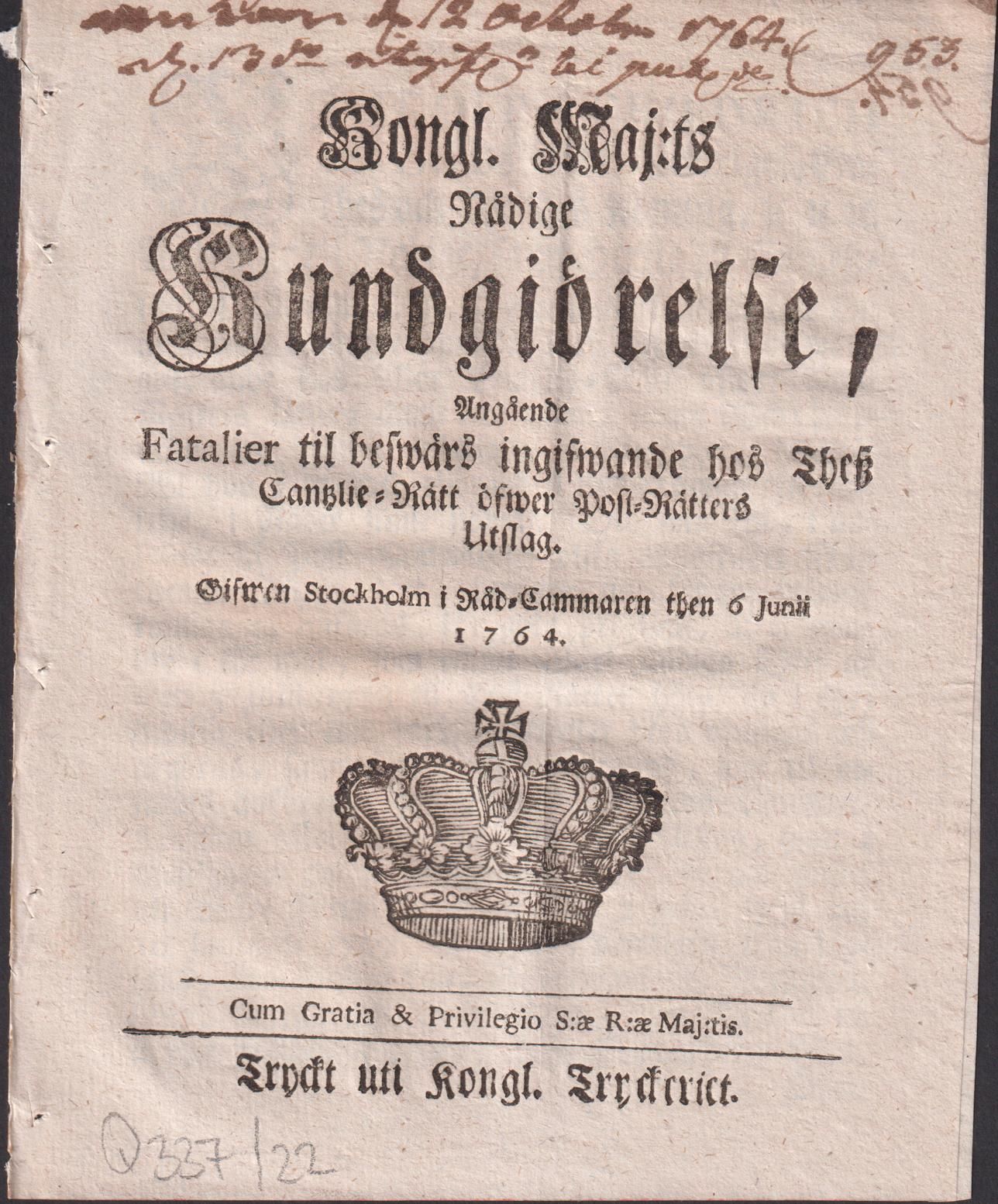 Kongl. maj:ts nådige Kundgiörelse, Angående Fatalier til beswärs ingifande hos Thesz Cantzlie-Rätt öfwer Post-Rätters Utslag. Gifwen Stockholm i Råd-Cammaren then 6 junii 1764.