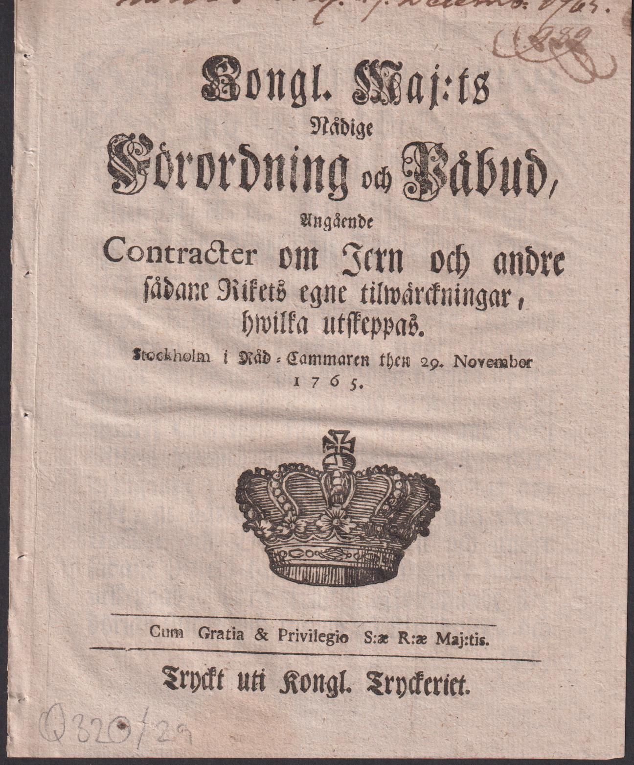 Kongl. maj:ts nådige Förordning och Påbud, Angående Contracter om Jern och andre sådane Rikets egne tilwärckningar, hwilka utskeppas. Stockholm i Råd-Cammaren then 29. november 1765.