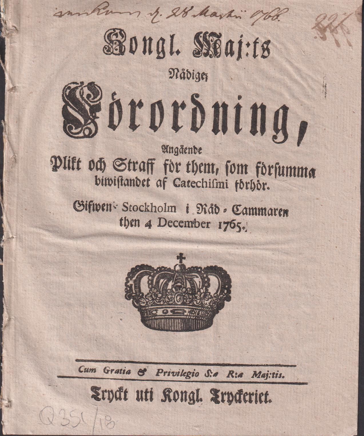 Kongl. maj:ts nådige Förordning, Angående Plikt och Straff för them, som försumma biwistande af Catechismi förhör. Gifwen Stockholm i Råd-Cammaren then 4 december 1765.