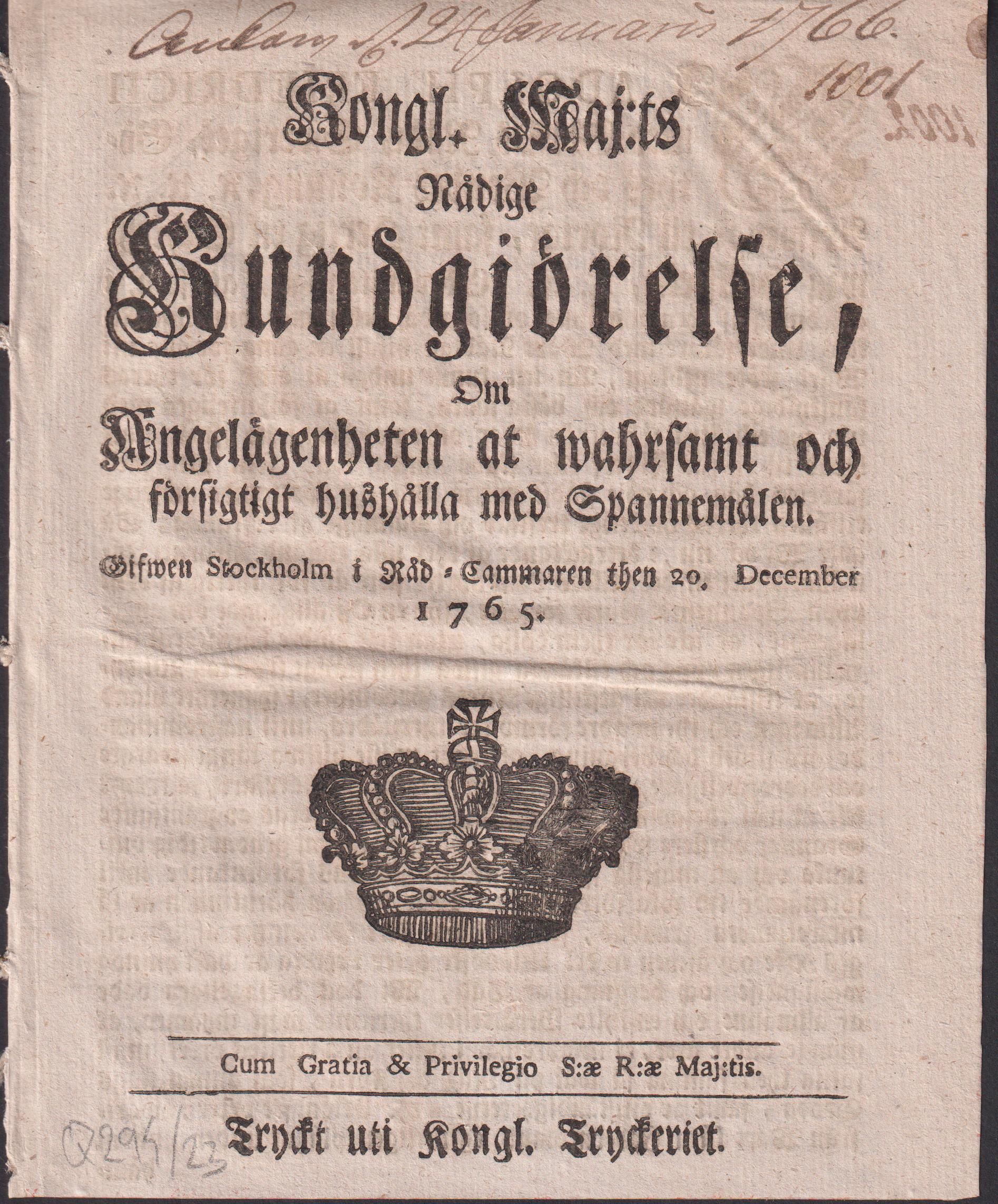 Kongl. maj.ts nådige Kundgiörelse, Om Angelägenheten at wahrsamt och försigtigt hushålla med Spannemålen. Gifwen Stockholm i Råd-Cammaren then 20. december 1765.