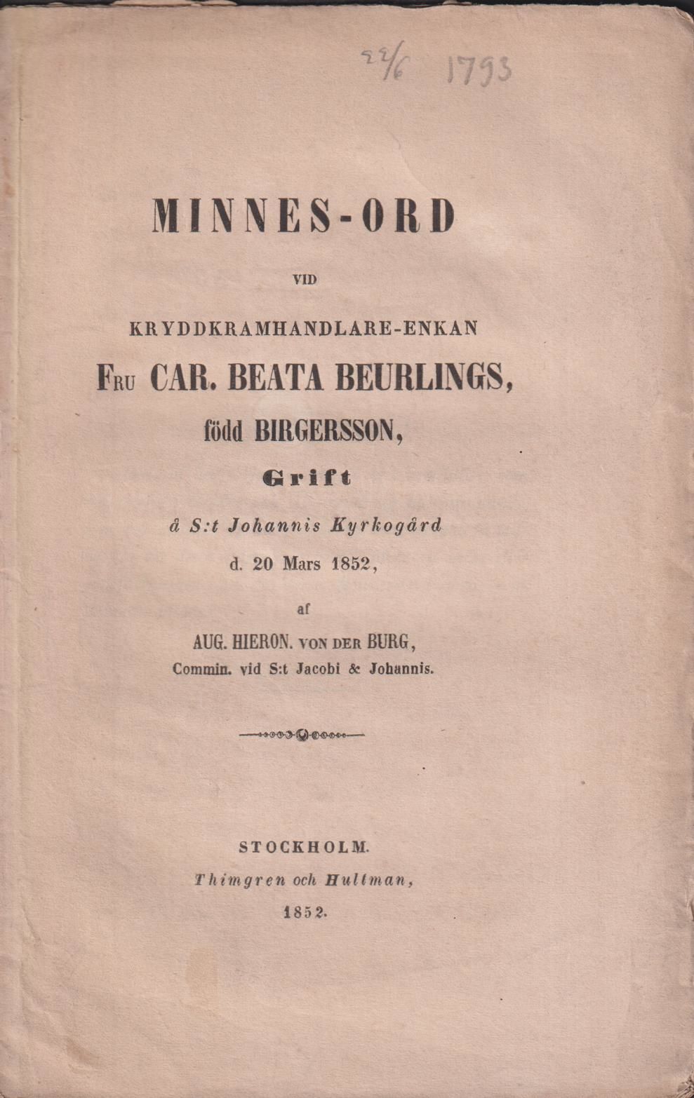 Minnes-ord vid kryddkramhandlare-enkan fru Car. Beata Beurlings, född Birgersson, grift å S:t Johannis kyrkogård d. 20 mars 1852, af Aug. Hieron. von der Burg ...