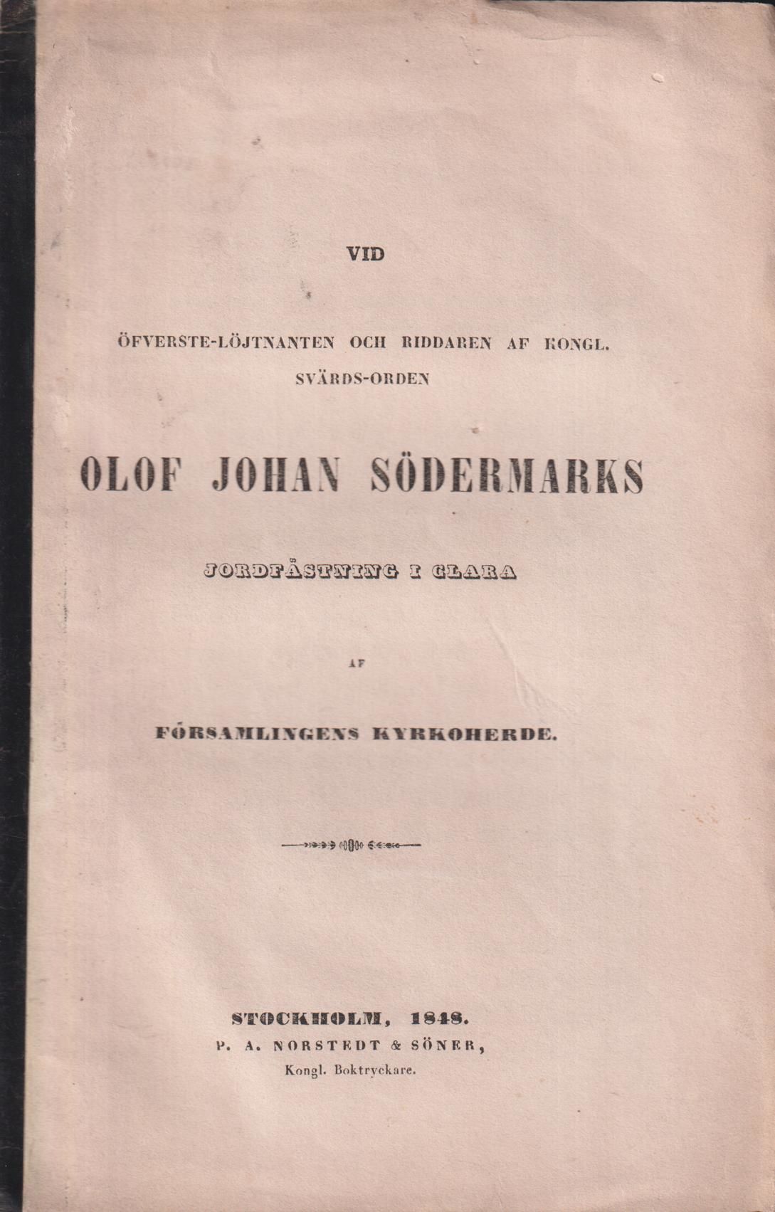 Vid öfverste-löjtnanten och riddaren af Kongl. Svärds-orden Olof Johan Södermarks jordfästning i Clara af församlingens kyrkoherde.