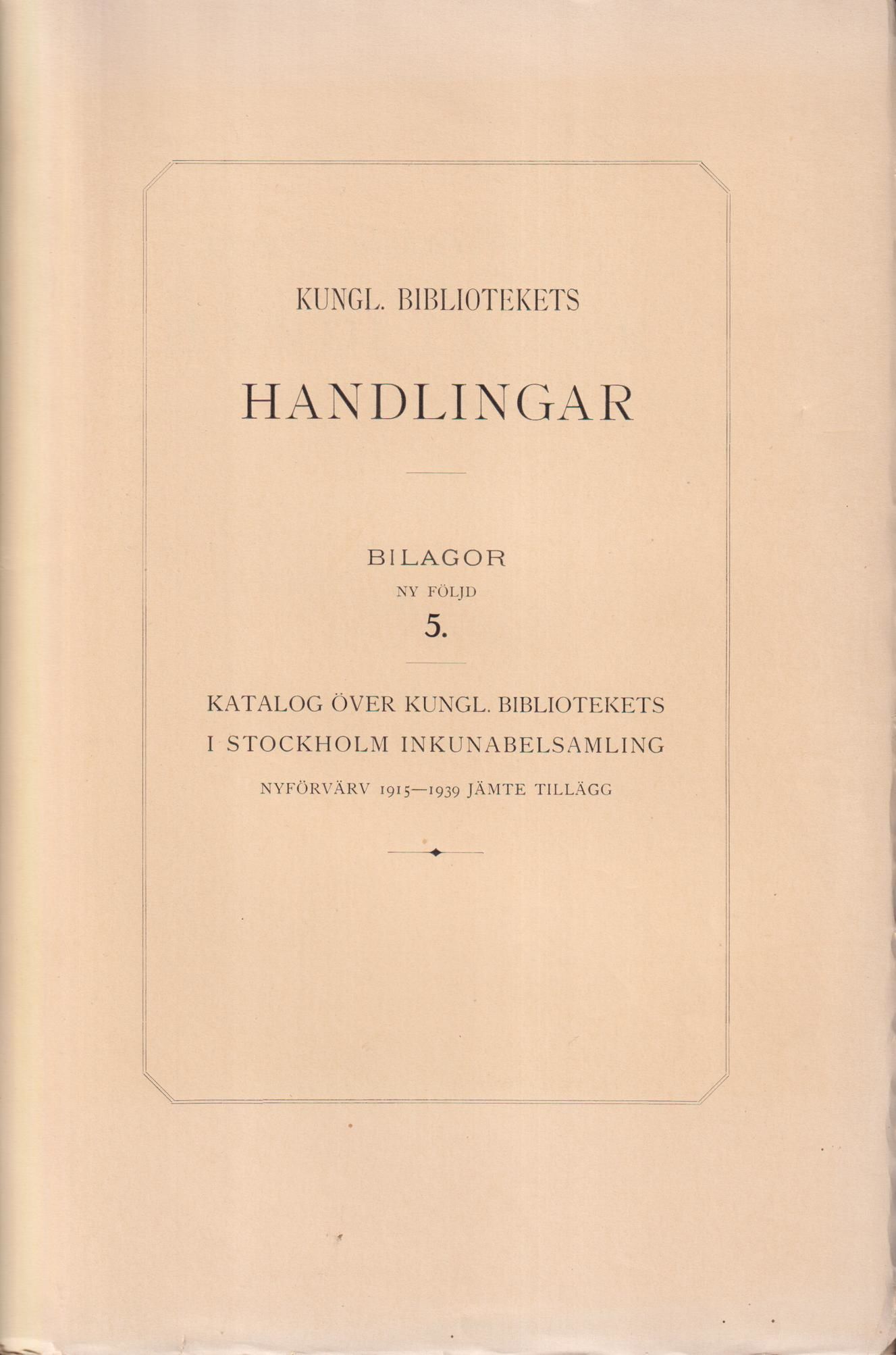 Katalog över Kungl. Bibliotekets i Stockholm inkunabelsamling. Nyförvärv 1915-1939 jämte tillägg till huvudkatalogen 1914.