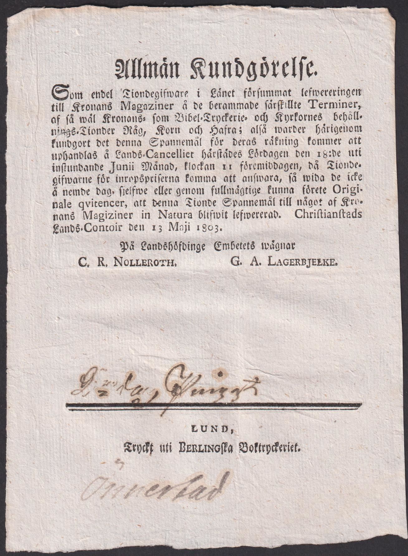 Samtida bläcknotering med uppgift om tid och plats för uppläsandet. Daterad ‘Christianstads Lands-Contoir den 13 maji 1803. Undertecknad ‘C.R. Nolleroth’ & ‘G.A. Lagerbjelke’.