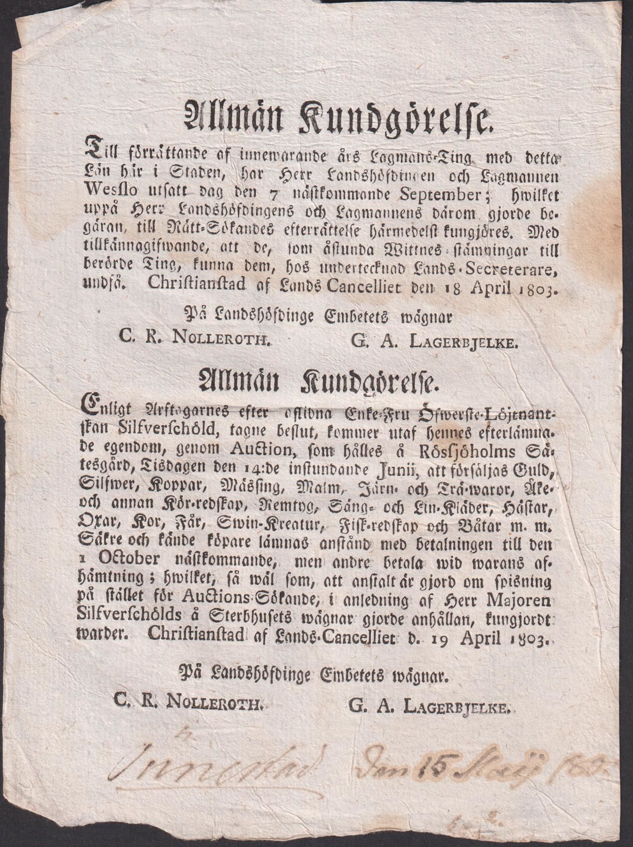 Samtida bläcknotering med uppgift om tid och plats för uppläsandet. Daterad ‘Christianstad af Lands Cancelliet den 18 april 1803’, resp. ‘... d. 19 april 1803’. Undertecknad ‘C.R. Nolleroth’ & ‘G.A. Lagerbjelke’.