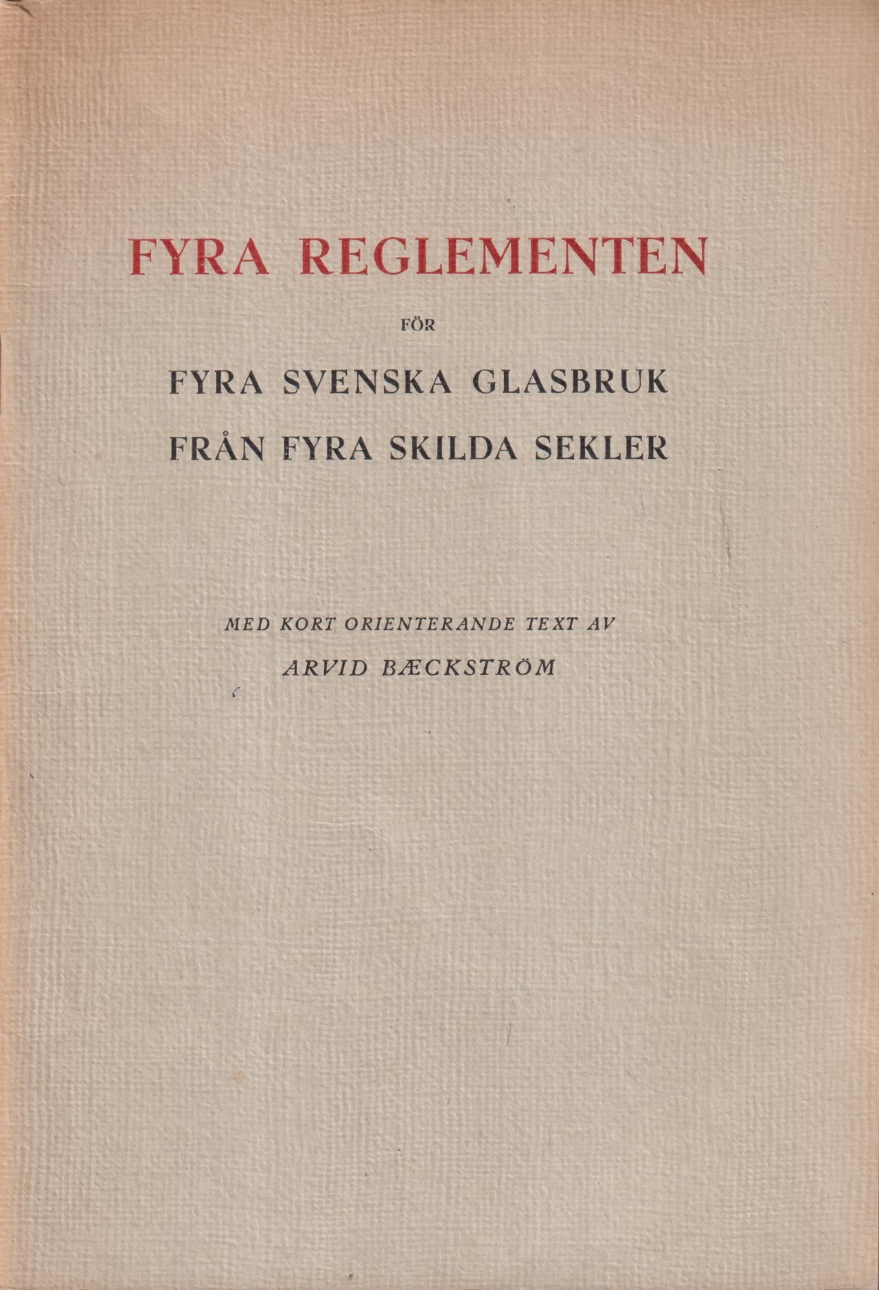 Fyra reglementen för fyra svenska glasbruk från fyra skilda sekler. Med kort orienterande text av Arvid Bæckström. [Utg. av] Glasmuséet i Växjö.