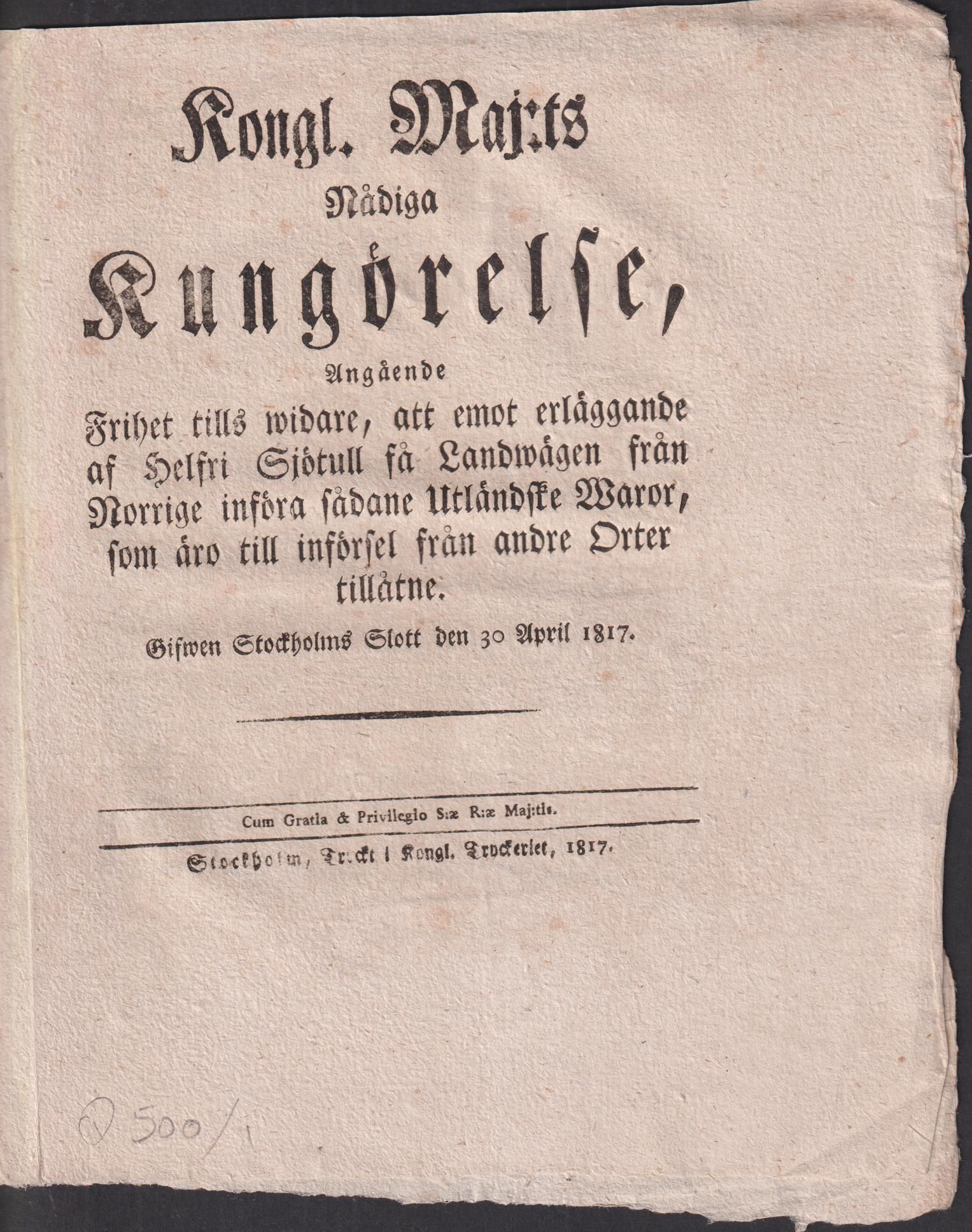 Kongl. maj:ts nådiga Kungörelse, Angående Frihet tills widare, att emot erläggande af Helfri Sjötull få Landwägen från Norrige införa sådane Utländske Waror, som äro till införsel från andre Orter tillåtne. Gifwen Stockholms Slott den 30 april 1817.