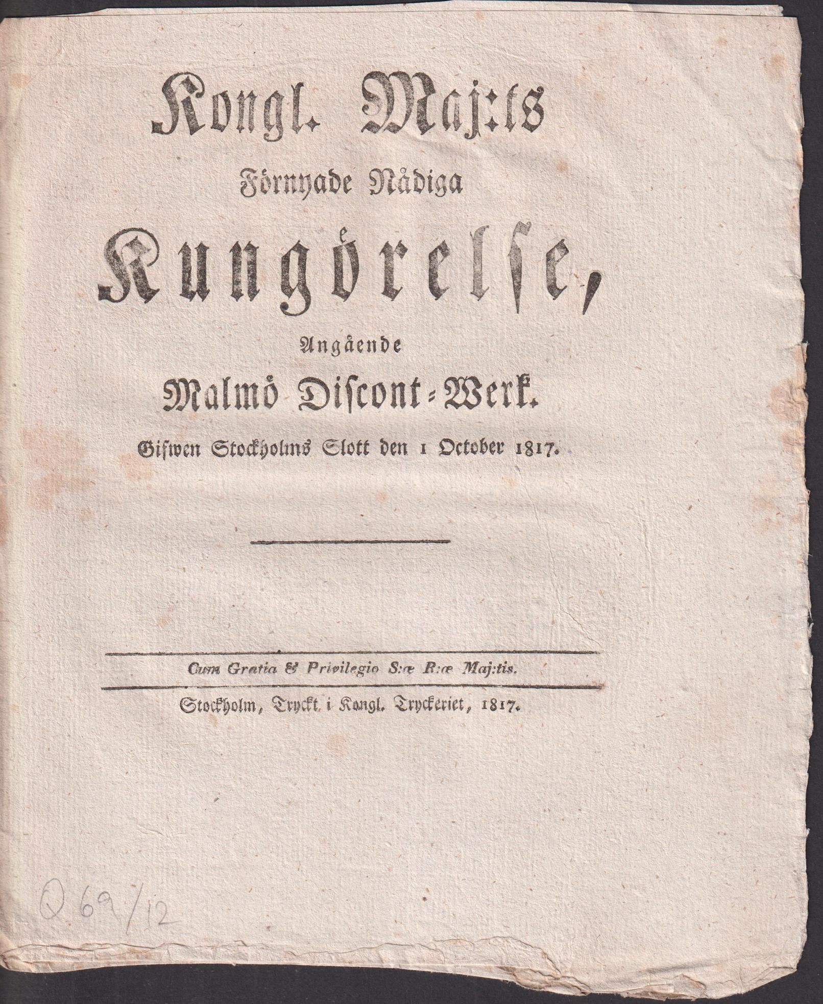 Kongl. maj:ts förnyade nådiga Kungörelse, Angående Malmö Discont-Werk. Gifwen Stockholms Slott den 1 october 1817.
