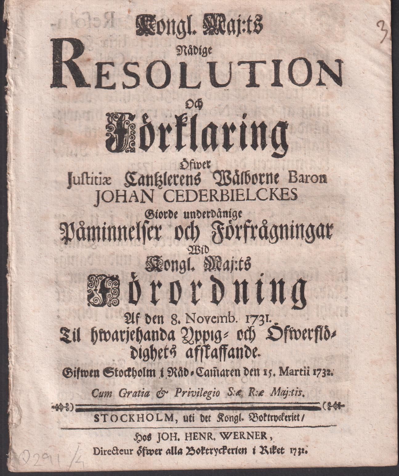 Kongl. Maj:ts Nådige Resolution Och Förklaring Öfwer Justitiæ Cantzlerens Wälborne Baron Johan Cederbielckes Giorde underdånige Påminnelser och Förfrågningar Wid Kongl. Maj:ts Förordning Af den 8 Novemb. 1731. Til hwarjehanda Yppig- och Öfwerflödighets affskaffande. Gifwen Stockholm i Råd-Cammaren den 15. Martii 1732.