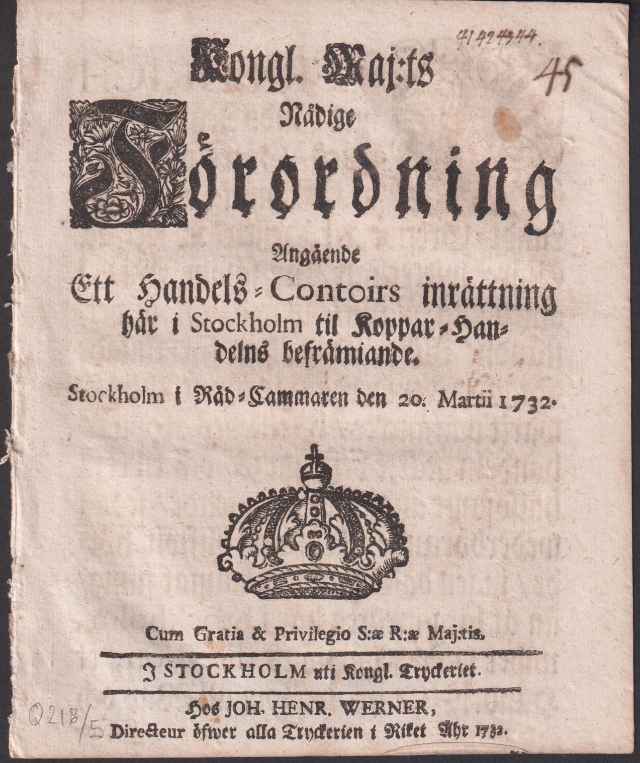 Kongl. Maj:ts Nådige Förordning Angående Ett Handels-Contoirs inrättning här i Stockholm til Koppar-Handelns befrämiande. Stockholm i Råd-Cammaren den 20. Martii 1732.