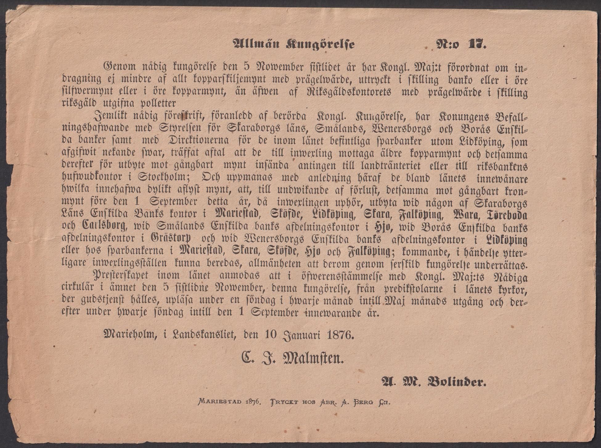 Angående inväxling av äldre kopparmynt efter indragning av allt kopparskiljemynt med prägelvärde, uttryckt i skilling banko eller i öre silvermynt / kopparmynt. Daterad ‘Marieholm, i Landskansliet, den 10 januari 1876’, undertecknad ‘C.J. Malmsten’, kontrasignerad ‘A.M. Bolinder’.