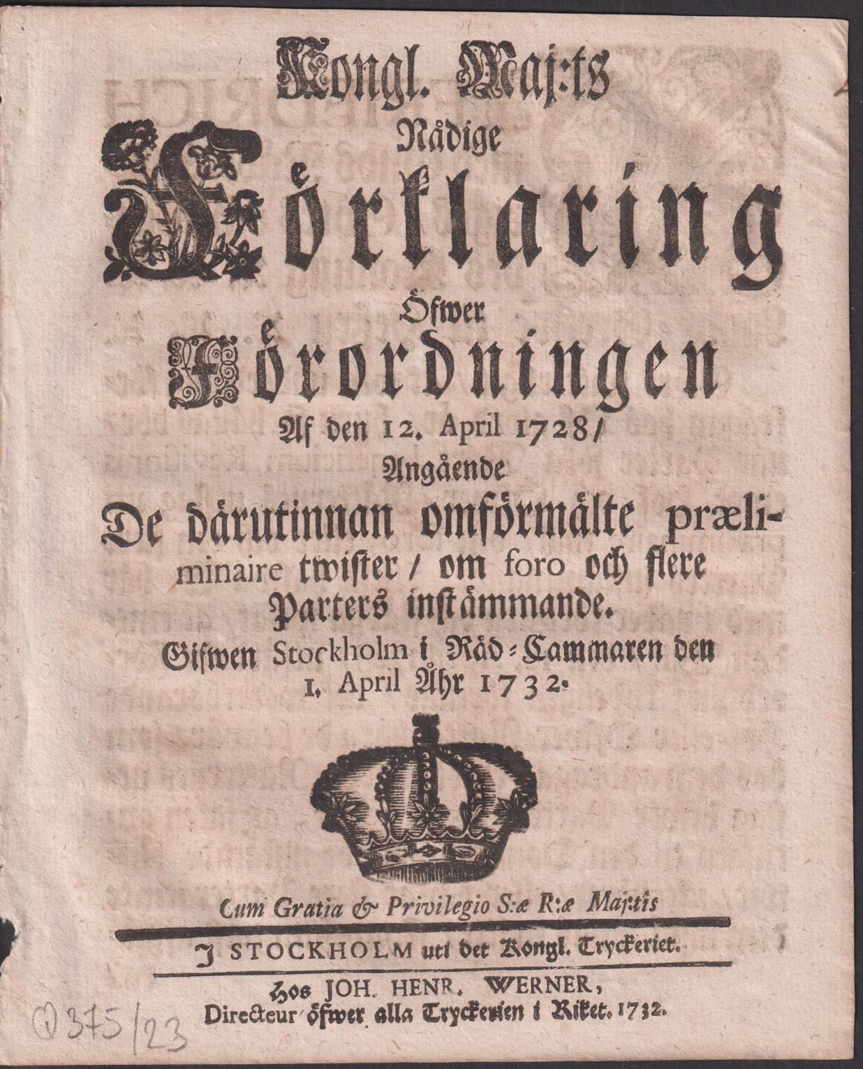 Kongl. Maj:ts Nådige Förklaring Öfwer Förordningen Af den 12. April 1728, Angående De därutinnan omförmälte præliminaire twister, om foro och flere Parters instämmande. Gifwen Stockholm i Råd-Cammaren den 1. April Åhr 1732.