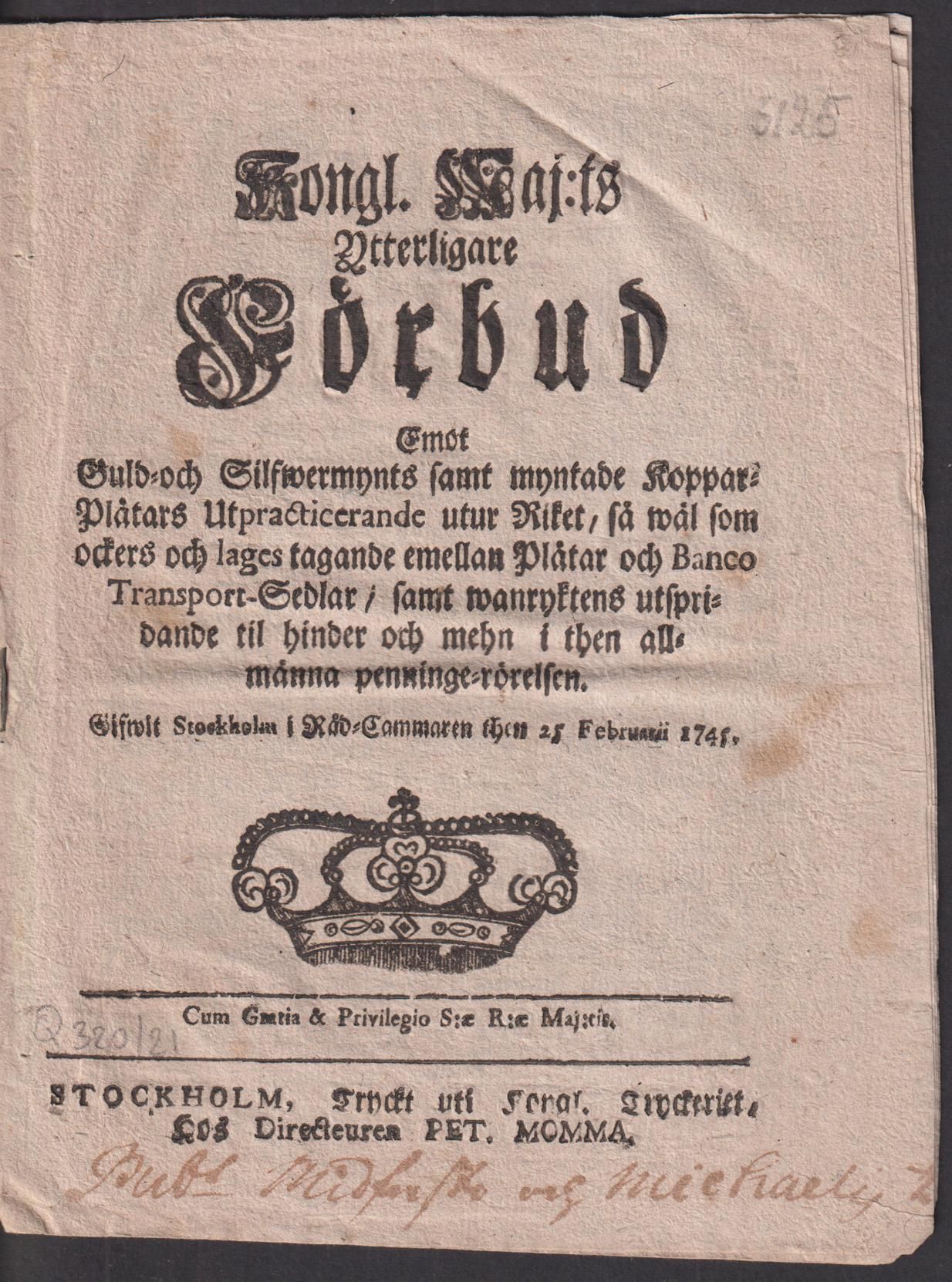 Kongl. maj:ts Ytterligare Förbud Emot Guld- och Silfwermynts samt myntade Koppar-Plåtars Utpracticerande utur Riket, så wäl som ockers och lages tagande emellan Plåtar och Banco Transport-Sedlar, samt wanryktens utspridande til hinder och mehn i then allmänna penninge-rörelsen. Gifwit Stockholm i Råd-Cammaren then 25 februarii 1745.