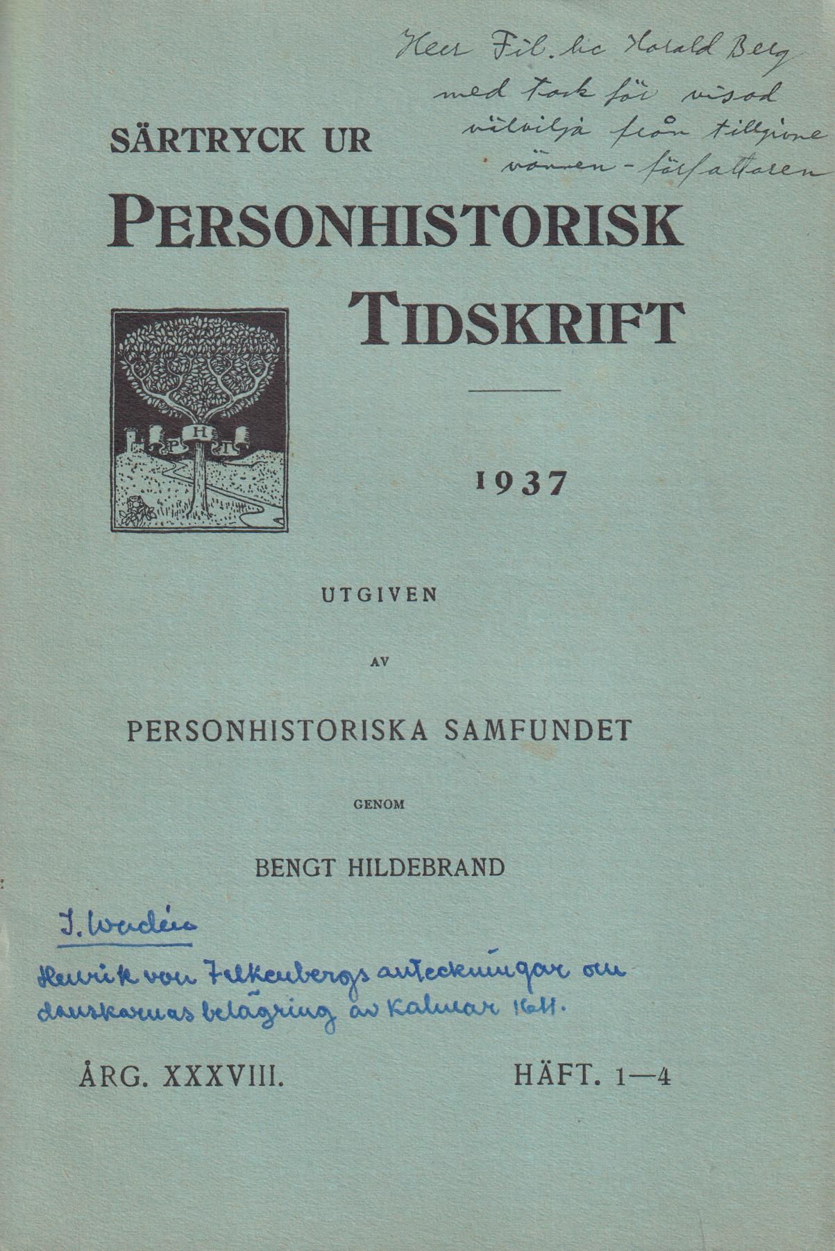 Särtryck ur ‘Personhistorisk Tidskrift 1937. Årg. XXXVIII. Häft. 1-4’.