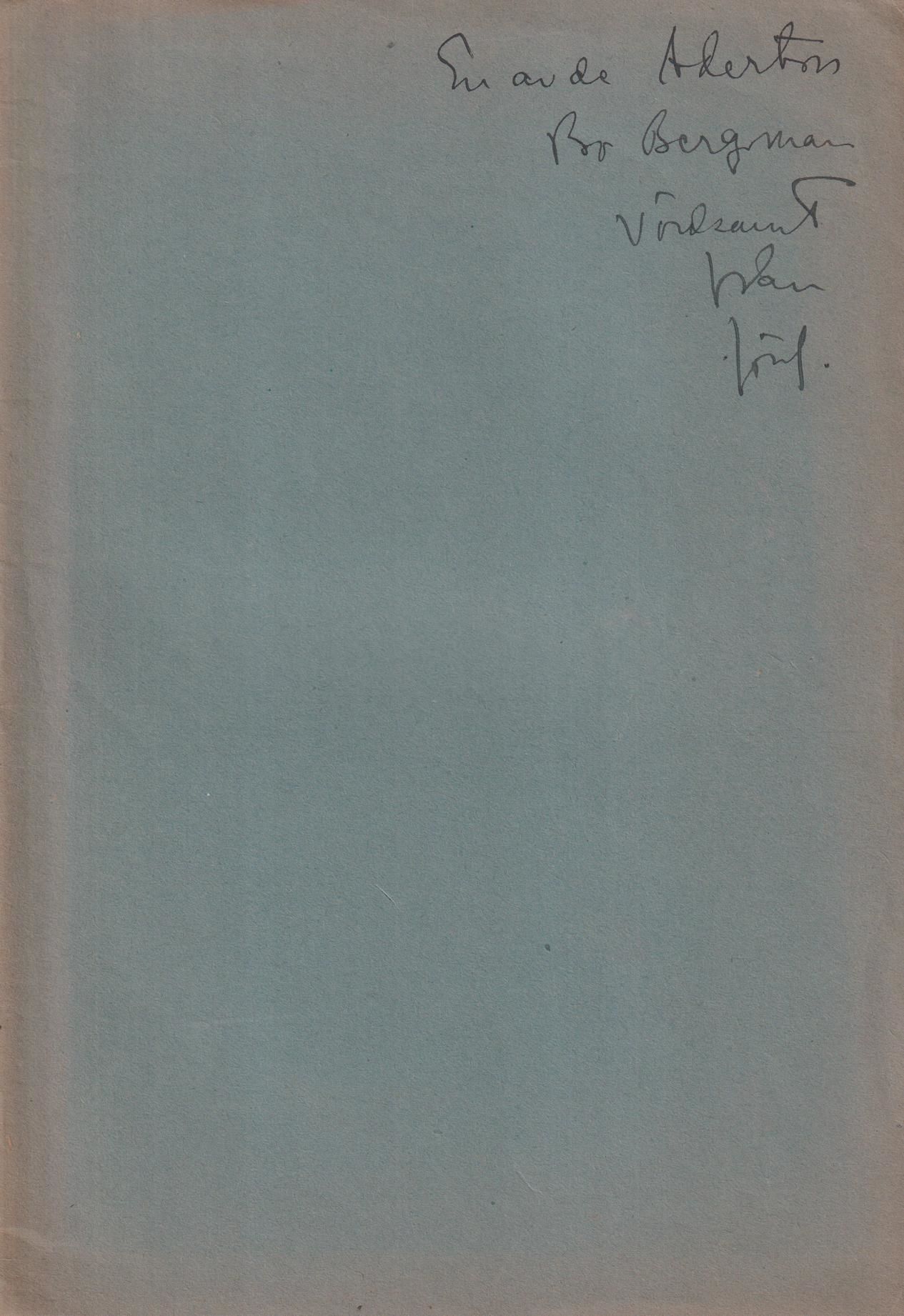 [Stockholm, Alb. Bonniers boktr., 1913]. 8:o. s. [270]-279. Illustrerad. Klammerhäftad med styvt något ojämnt solbränt pappersomslag. Tillskrift ‘En av de Aderton / Bo Bergman / vördsamt från / förf.’ på främre omslag.