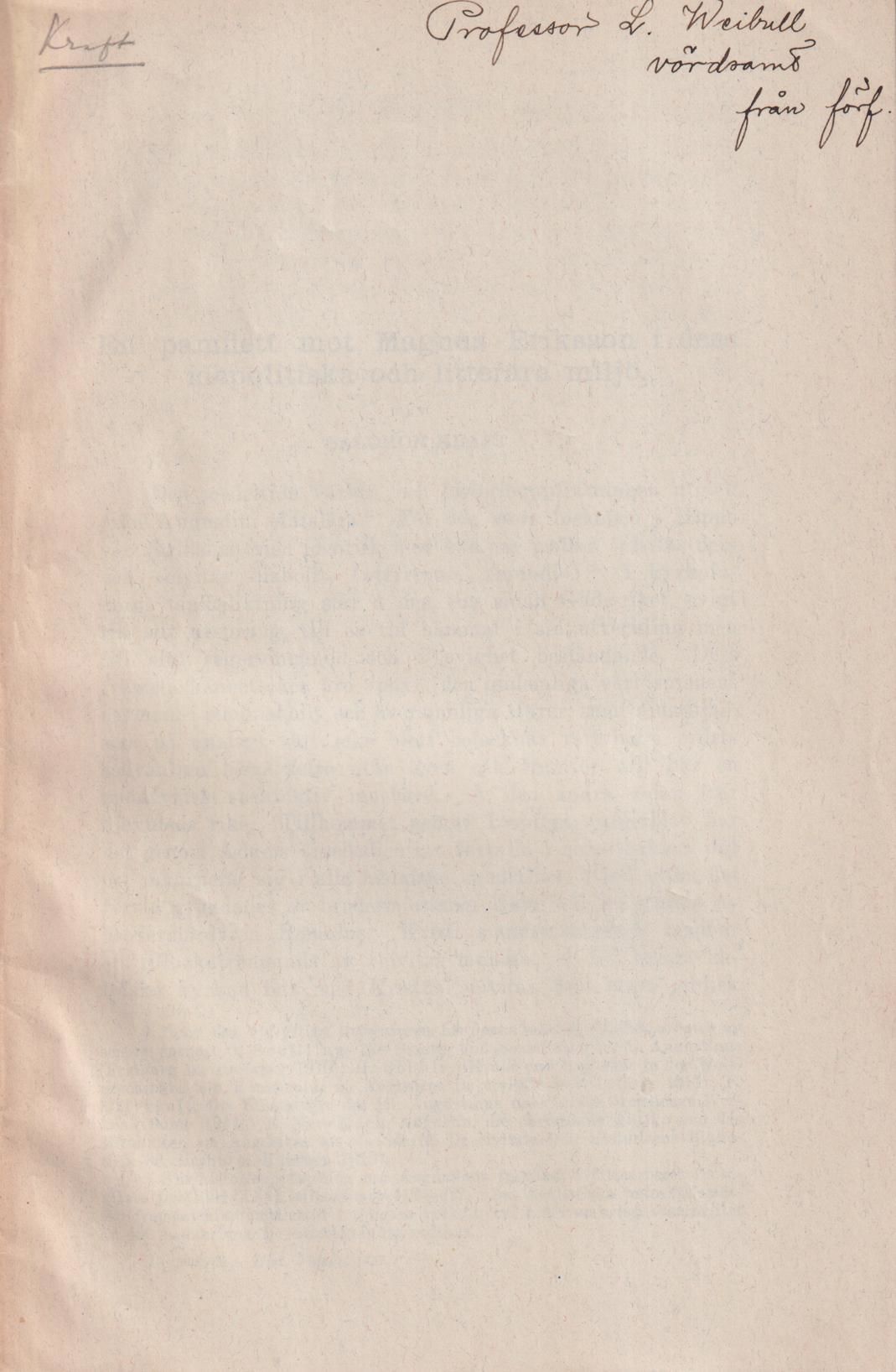 Stockholm, P.A. Norstedt & Söner, 1927. 8:o. 27 s. Trådhäftad med styvt anonymt pappersomslag. Tillskrift ‘Professor L. Weibull / vördsamt / från förf.’ på främre omslag.