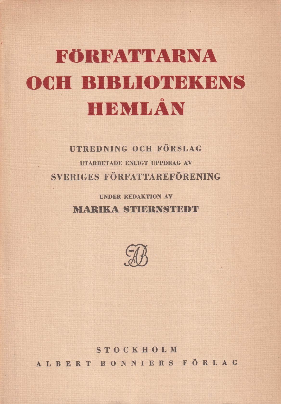 Författarna och bibliotekens hemlån. Utredning och förslag utarbetade enligt uppdrag av Sveriges författareförening. [Utg. av] Albert Bonniers förlag.