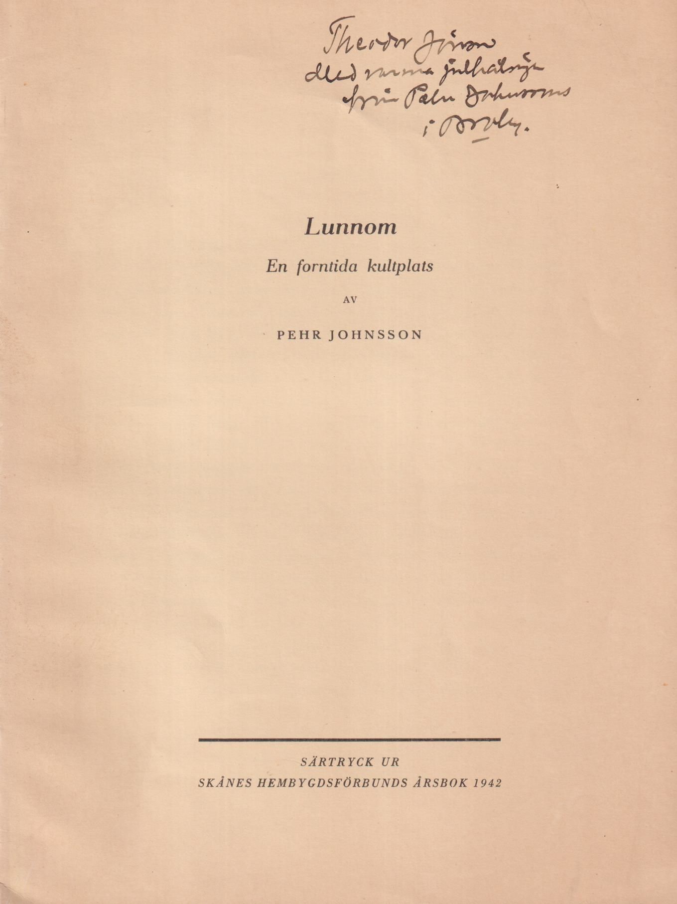 Lund, Skånska Centraltryckeriet, 1942. 8:o. s. 11-17. Illustrerad. Limhäftad med styvt tryckt ljusgult pappersomslag. Välhållet exemplar. Tillskrift ‘Theodor Jönsson / Med varma julhälsningar / från Pehr Johnsson / i Borrby’ på främre omslag. Stämpel ‘Theodor Jönssons stiftelse / 305’ på bakre omslagets insida.