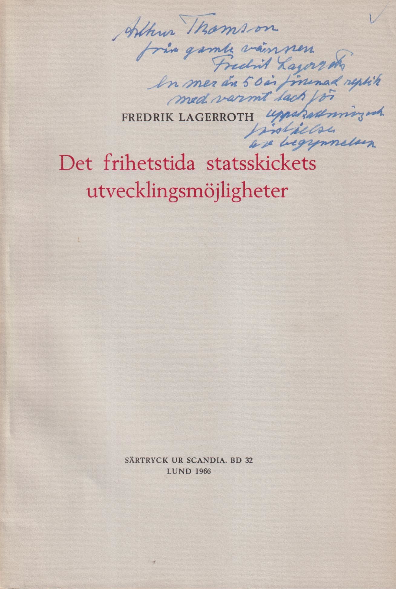 Lund, Berlingska Boktryckeriet, 1966. 8:o. s. [213]-267. Klammerhäftad med styvt tryckt ljusgrått pappersomslag. Tillskrift ‘Arthur Thomson / från gamle vännen / Fredrik Lagerroth ...’ på främre omslag.