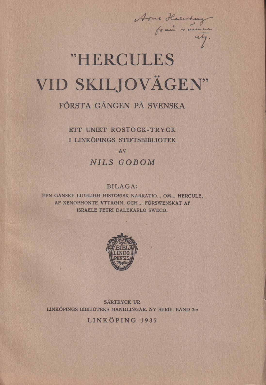 ‘Hercules vid skiljovägen’ Första gången på svenska. Ett unikt Rostock-tryck i Linköpings stiftsbibliotek. Bilaga: Een ganske liufligh historisk narration ... om ... Hercule, af Xenophonte Vttagin, och ... förswenskat af Israele Petri Dalekarlo Sweco.