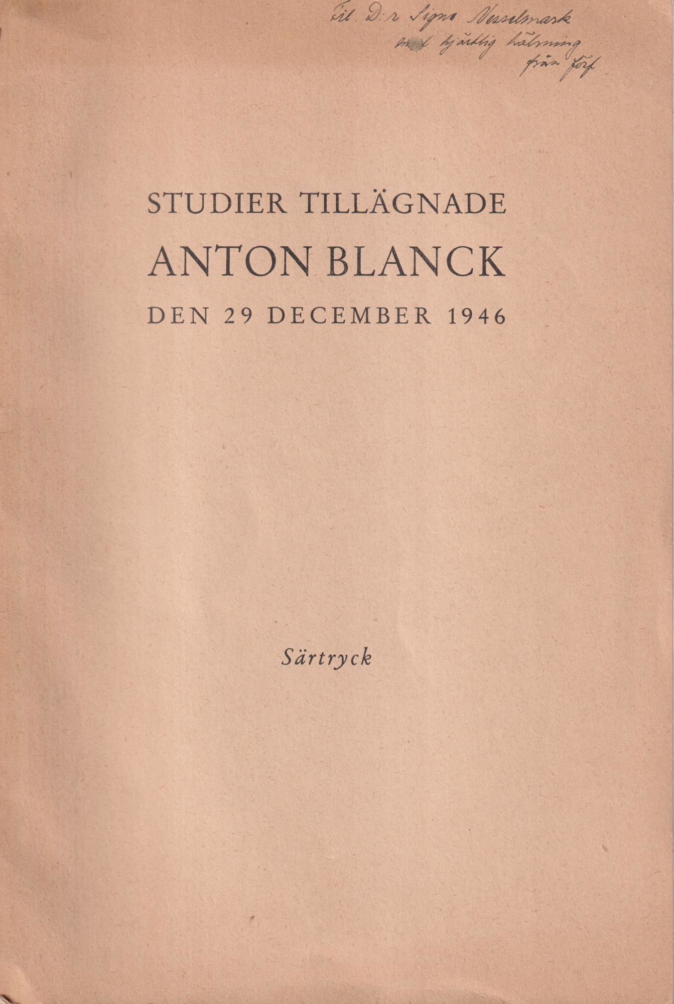 Särtryck ur ‘Studier tillägnade Anton Blanck den 29 december 1946’.