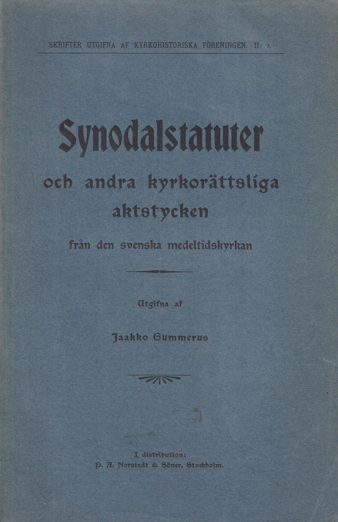 Synodalstatuter och andra kyrkorättsliga aktstycken från den svenska medeltidskyrkan utgifna af Jaakko Gummerus.