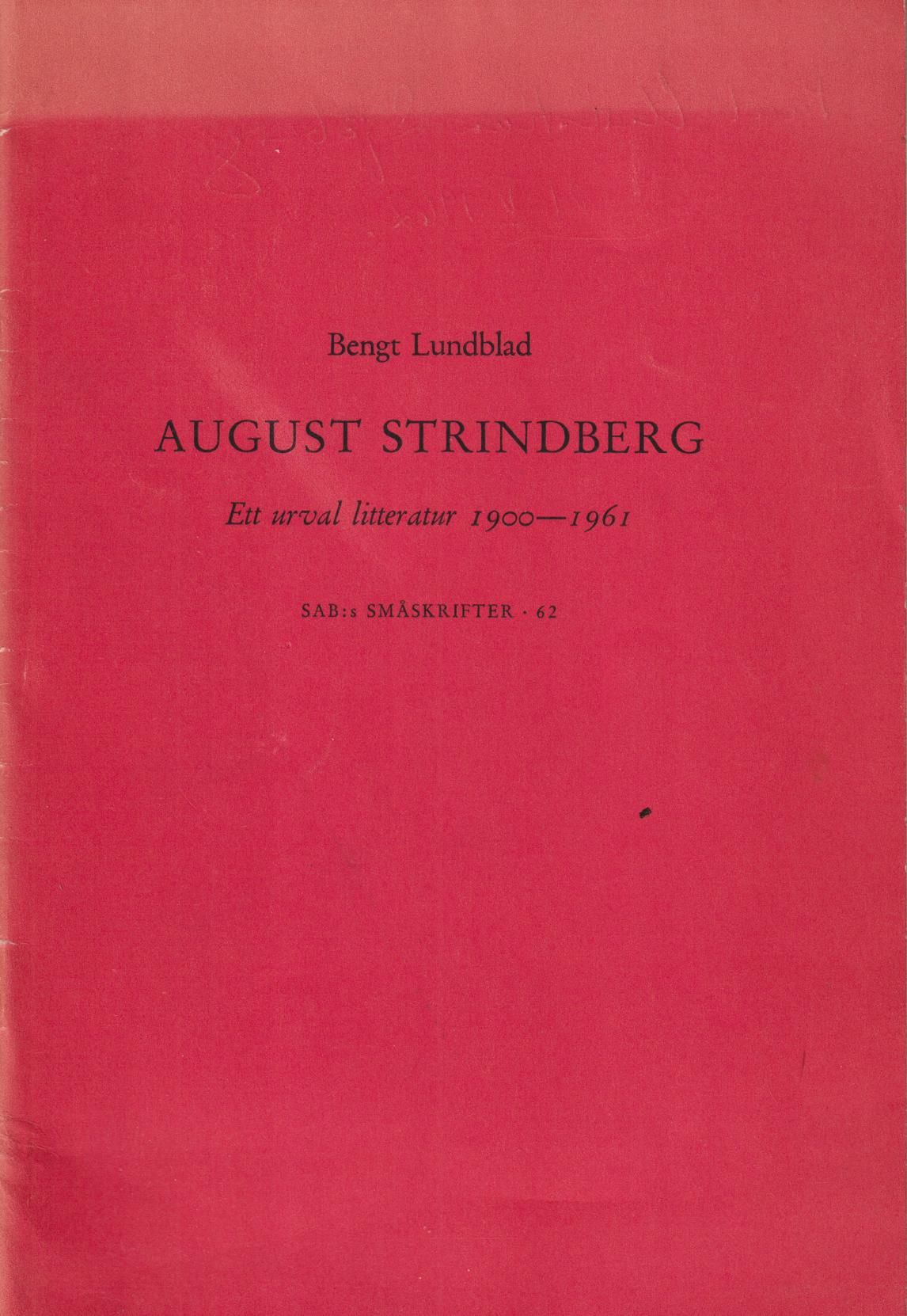 Sveriges allmänna biblioteksförenings småskrifter 62. Marginalnoteringar i blyerts förekommer. Innehåll: Bibliografi; Strindbergs skrifter; Strindberg som brevskrivare; Litteratur om Strindberg (Allmän avdelning; Särskilda verk; Strindberg som dramatiker - Strindberg och teatern; Strindberg som lyriker; Strindberg som målare och modell).