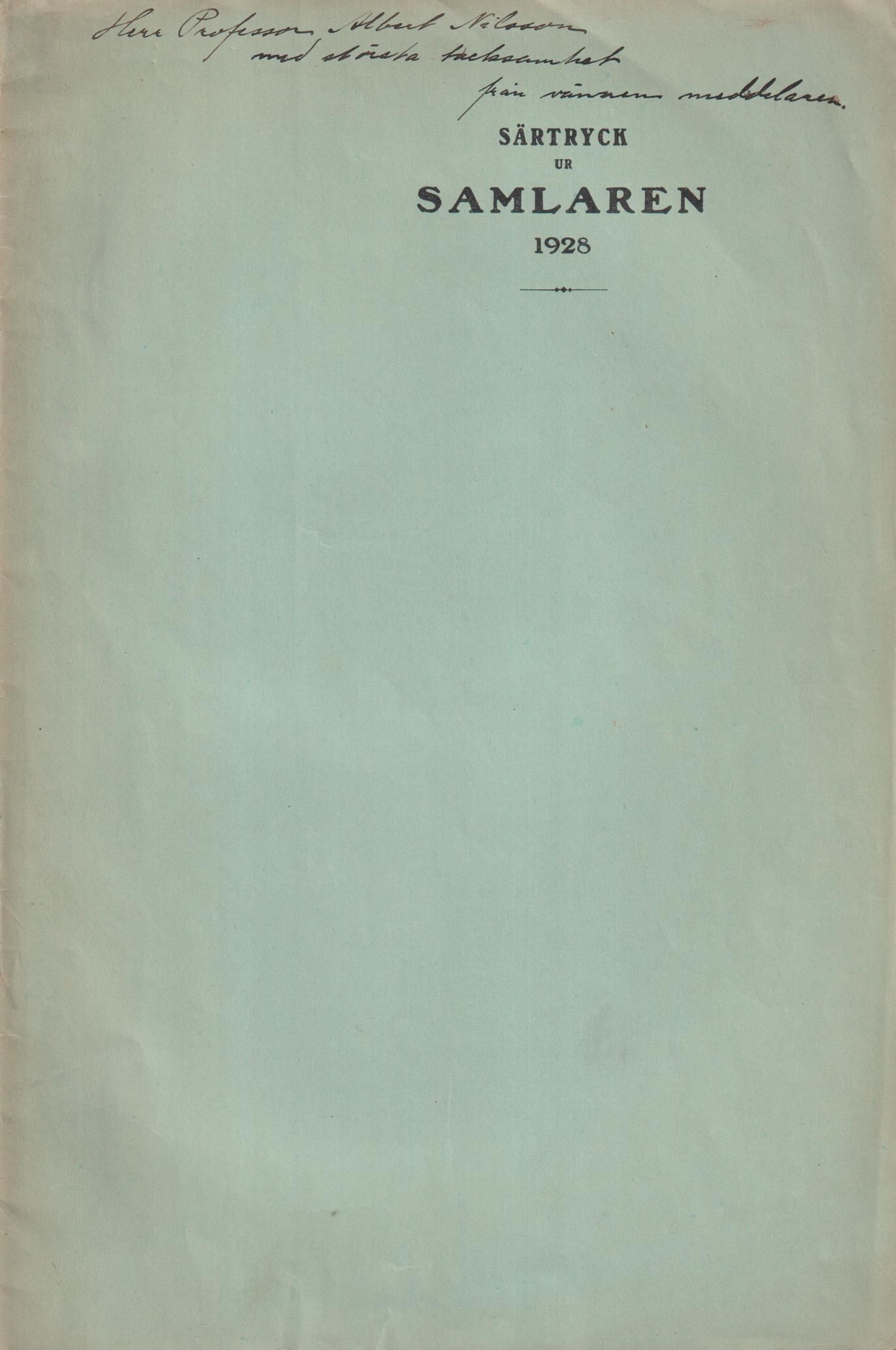 Uppsala, Almqvist & Wiksells Boktryckeri-A.-B., 1928. 8:o. 17 s. Klammerhäftad med styvt tryckt ljusgrönt pappersomslag. Tillskrift ‘Herr Professor Albert Nilsson / med största tacksamhet / från vännen meddelaren’ på främre omslag.