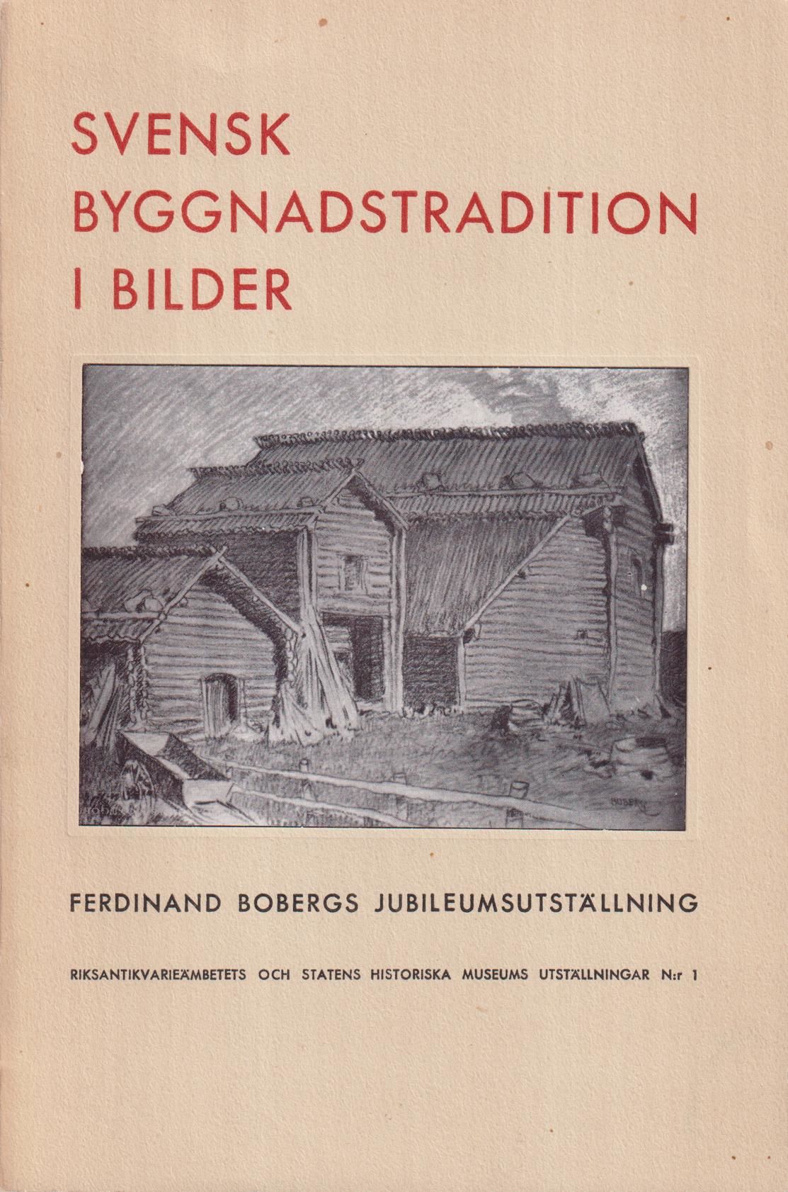 Riksantikvarieämbetets och Statens historiska museums utställningar 1. Innehåll: Ferdinand Bobergs jubileumsutställning, av Sigurd Curman; Svensk byggnadstradition, av Erik Lundberg; Hembygdsstudier med utgångspunkt från Ferdinand Bobergs bilder, av John Nihlén; Samlingarnas tillkomst, av Ferdinand Boberg; Förteckning över Ferdinand Bobergs arbeten till den svenska kulturminnesvårdens tjänst.