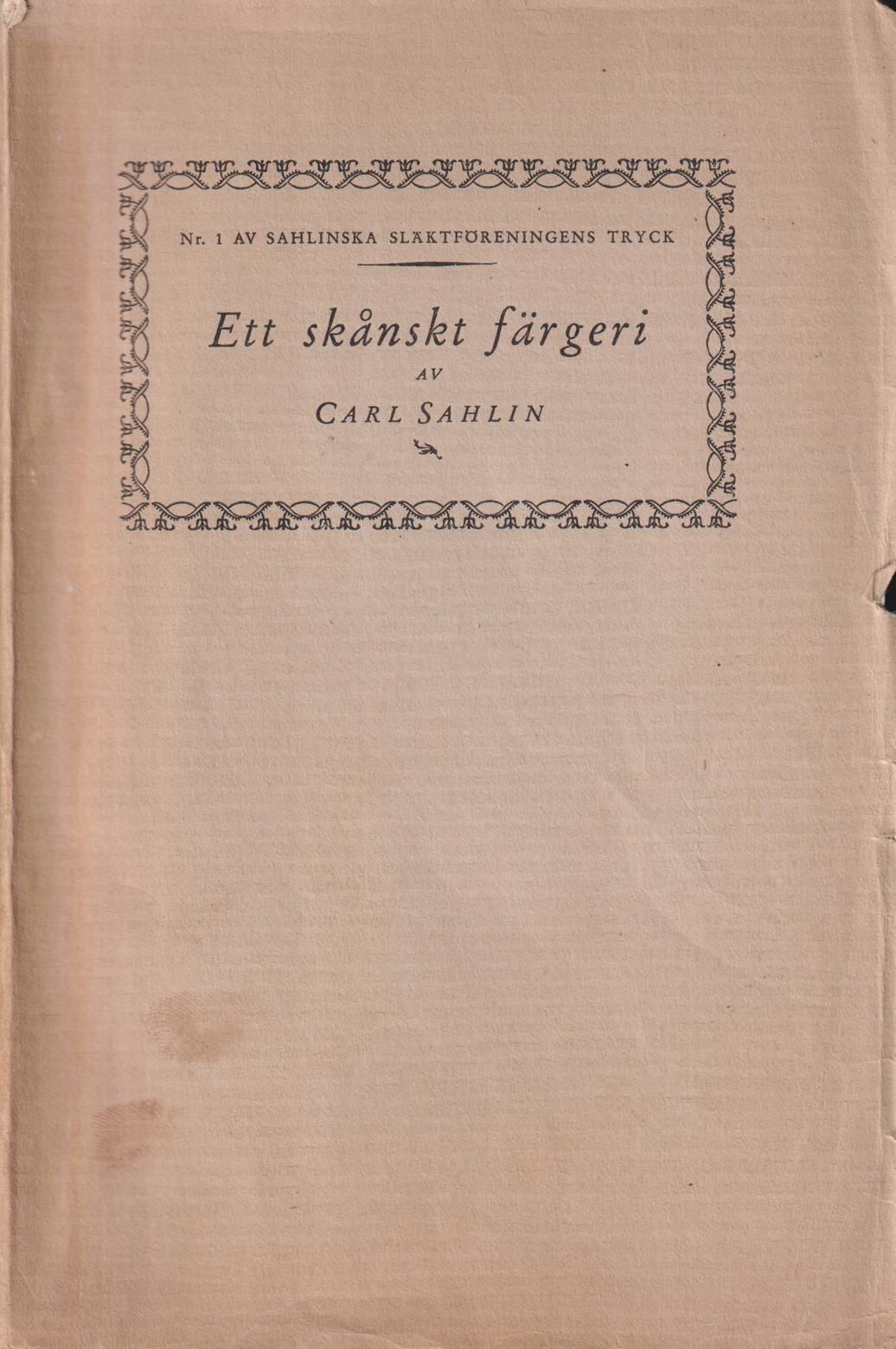 Althin ‘Studera och probera’ 264. Sandqvist ‘Litteratur om svenska industriföretag’ 1921. Sahlinska släktföreningens tryck. N:r 1. Omslagstitel ‘Ett skånskt färgeri’.