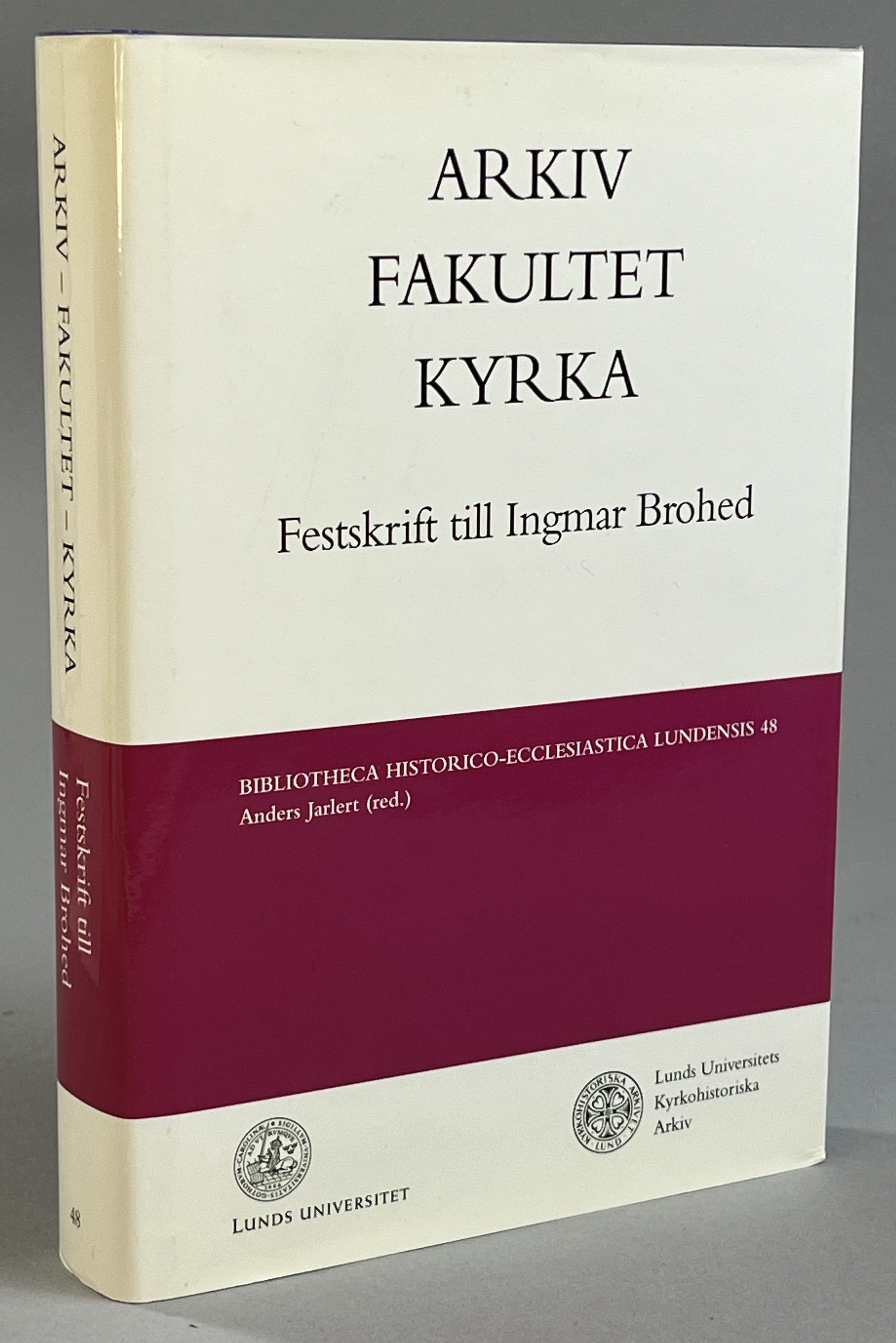 Bibliotheca historico-ecclesiastica Lundensis 48. Bilagt tryckt tackkort från Brohed. Innehåll: Förord; Tabula gratulatoria; Universitetens roll i det nutida samhället, av Göran Bexell; Gustav Vasas kungaeder, av Lennart Tegborg; Biskopssläkter i Svenska kyrkan, av Rune Imberg; Prästen i prästgård och församling. Prästbiografisk forskning i Sverige, av Ragnar Norrman; Den humanistiska forskningen tillämpad på kyrkohistorien, ett tidigt exempel, av Ingun Montgomery; Perspektiv på Altranstädt, av Harry Lenhammar; Josias Cederhielm - diplomaten som teolog, av Björn Ryman; En herrnhutisk plantskola i Göteborgs stift, av Bertil Rehnberg; Ärkebiskop Jacob Tengströms kyrkolagsarbete i komparativt perspektiv, av Gustav Björkstrand; Det förgängliga gruset och evighetens glädje. En artikel om Esaias Tegnér, av Catharina Segerbank; Lina Sandell och Jönköping, av Göran Åberg; Lysning med fördröjning. Ett baptistiskt civiläktenskap 1879, av Owe Samuelsson; Tröst för gamla. Kring Gottfrid Billings bönböcker, av Birgitta Oden; Högkyrkligt kontra lågkyrkligt i generationsteoretiskt perspektiv, av Ruth Franzén; Nordiske folkekirker i internationalt perspektiv - Aspekter fra det 20. Årh.s förste årtier, av Jens Holger Schjerring; Frågan om kvinnliga präster. Ett debattinlägg från teologiska fakulteten i Lund på 1920-talet, av Carl-Gustaf Andrén; Nathan Söderbloms initiativ för missionen i Asien, av Lars Österlin; Nathan Söderblom and American Fundamentalism, av Kajsa Ahlstrand; A City upon a Hill? Aspects of U.S. Foreign Policy and Contemporary Theories On American Religion and Politics, av Kjell O. Lejon; Prostmötet i Göteborgs stift eller Konsten att skriva kyrkohistoria utan källor, av Anders Jarlert; Politik i stället för religion. Avkristnandet av den moderna svenska rättskulturen 1950-2000. Några huvudlinjer, av Kjell Å. Modéer; Religion i årsböcker - en kulturindikator? av Göran Gustafsson; Kyrkohistoriska arkivet - utveckling och kontinuitet, av Thomas Björkman; Frågelistorna och den kyrkliga seden, av Nils-Arvid Bringéus; Hett material? Religion och politik i de egyptiska arkiven, av Samuel Rubenson; Ett ekumeniskt försök i Linköping. Om den koordinerade syriskortodoxa och evangeliska nattvardsmässan vid ekumeniska riksmötet i Linköping 1999, av Martin Lind; Ingmar Broheds tryckta skrifter.