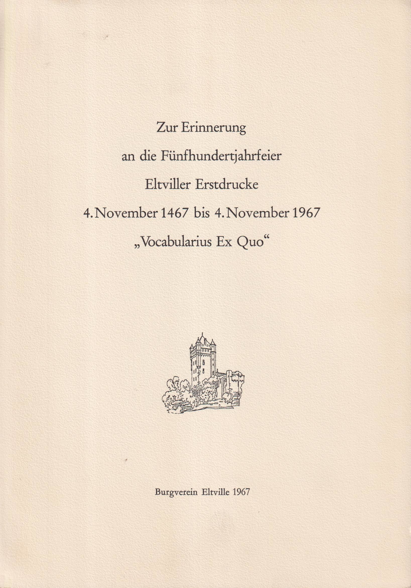 Zur erinnerung an die Fünfhundertjahrfeier Eltviller Erstdrucke 4. November 1467 bis 4. November 1967 ‘Vocabularius Ex Quo’ [= omslagstitel].