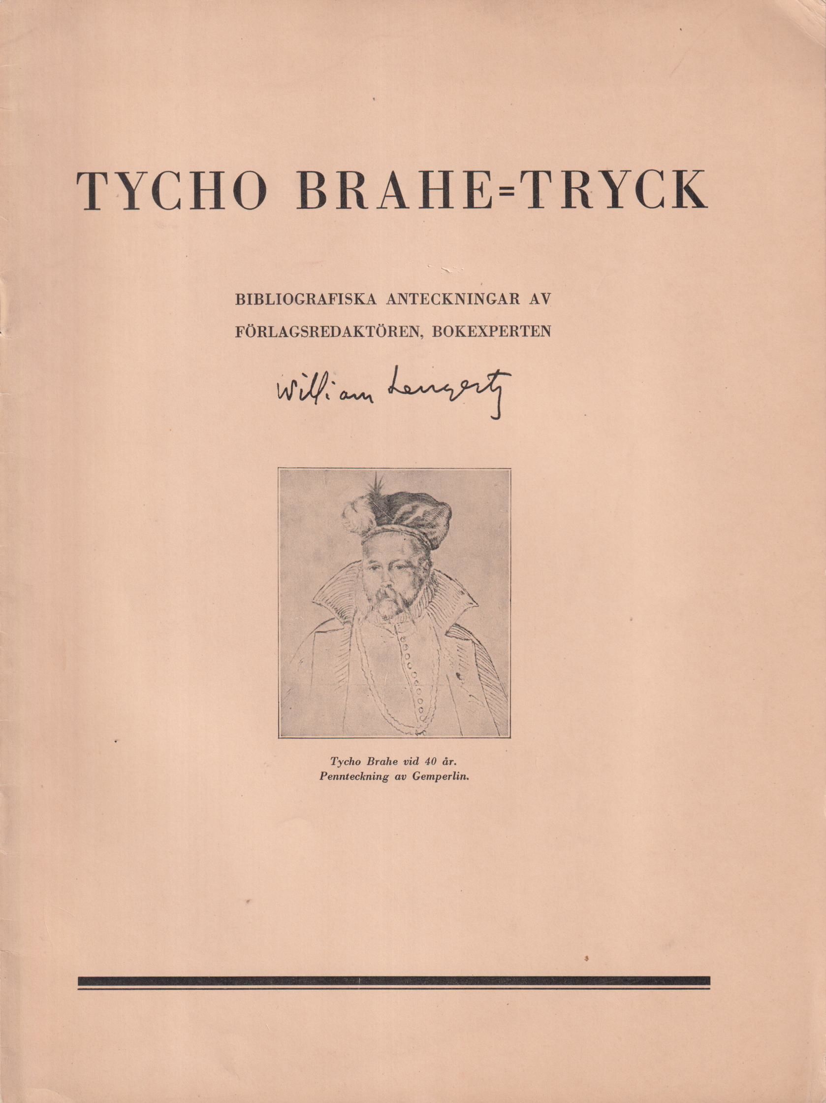 Tycho Brahe-tryck. Bibliografiska anteckningar av förlagsredaktören, bokexperten William Lengertz.