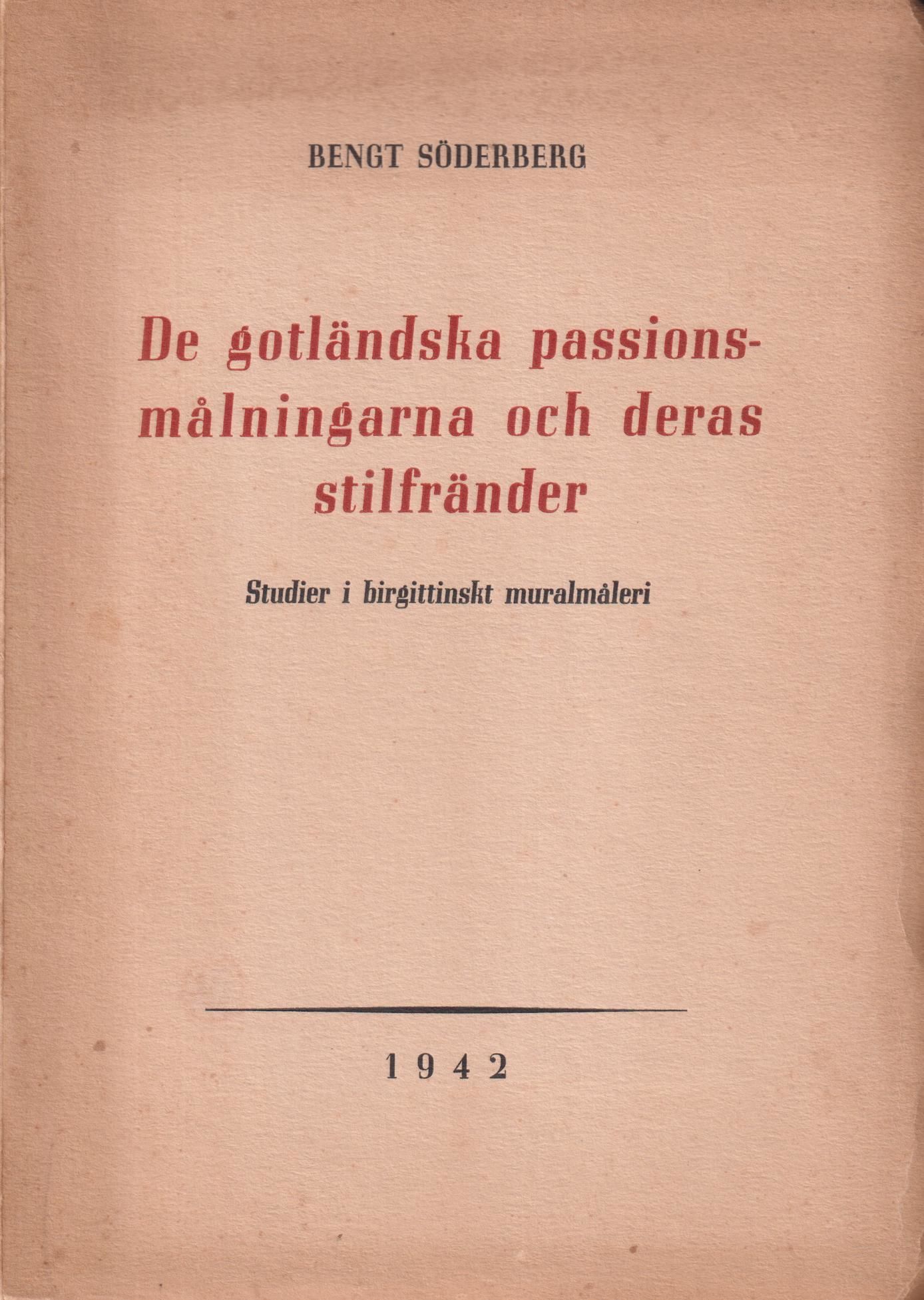 Dissertation från Stockholms Högskola, även utgiven som 'Kungl. Vitterhets historie och antikvitets akademiens handlingar. D. 54'. Innehåll: Förord; De gotländska passionsmålningarna (Inledning; Passionsmålningarnas dekorativa karaktär, ornamentik och figurstil; Gruppering och datering; Ikonografi; Passionsmålningarna och Misericordieverkstaden; Stilförbindelser); Det birgittinska måleriet (Inledning; Vadstena kloster som konstcentrum; Refektoriemålningarna och målningarna i Södra Åsarp; Risingemästaren; Målaren Nils Håkansson och Vittskövlemästaren; Målningarna i Tensta. Erentunagruppen; Målaren Amund; Vadstenaskolan och det äldre måleriet i Götaland; Spridda målningar av Vadstenaskolan; Målningarna i Fogdö och deras anförvanter; Birgittinska företeelser i Danmarks måleri; Yttre stilförbindelser); Exkurser (I. Pietàbilden. II. Legenden om de skvallrande kvinnorna. III. Om birgittinska ornamentmotiv hos Peter och Albertus); Corpus picturarum; Litteraturförteckning; Tillägg.