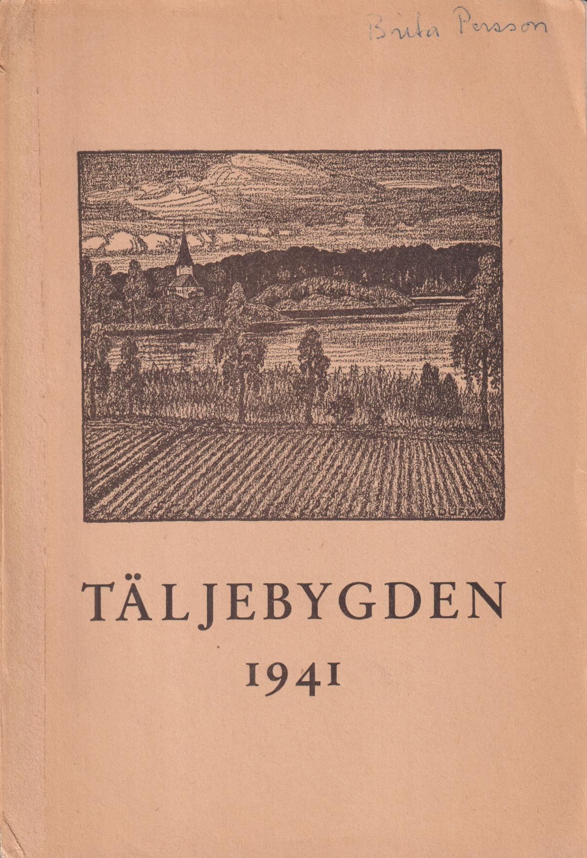 Rygg- & omslagstitel ‘Täljebygden 1941’. Innehåll: Salems kyrka, av Henrik Alm; Namnet Södertälje, av Jöran Sahlgren; Stockholms läns vapen, av Ivar Schnell; Våra hedniska förfäder och vi, av Jakob Pettersson; ‘Söder Telje äldsta sigill 1314’ - med en gris, av Niklas A. Lindhult; Ur SÖdertälje stads historia, av Hugo Eidem; Hvita hästen på Järna hed; Östra Sörmlands museum, av Torgny Dufwa; Turingeboken, av J.E.; Vilhelm Sjögren, av Joël Eriksson; Vårdträdet, av Rune Waldekranz; Års- och revisionsberättelser.