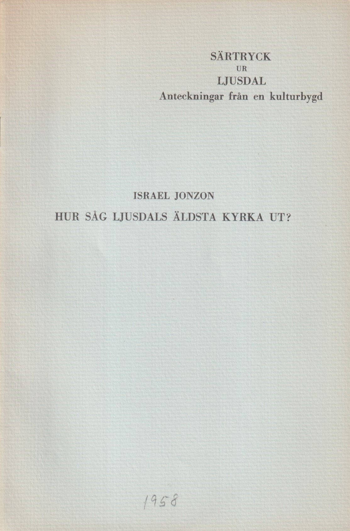 [Ljusdal, Eric Ericssons Boktryckeri, 1958]. 8:o. s. 146-157. Sparsamt illustrerad. Klammerhäftad med styvt tryckt ljusblått pappersomslag. Välhållet exemplar. Ur Sven-Gösta Jonzons bibliotek.