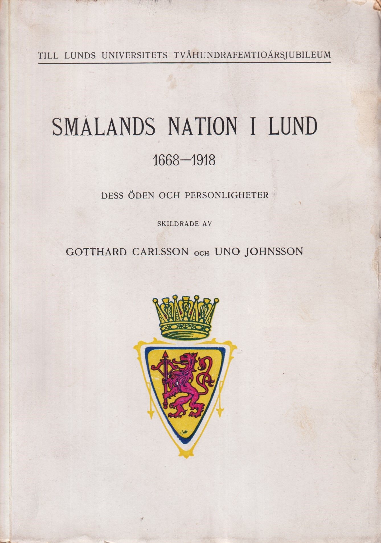 Smålands nation i Lund 1668-1918. Dess öden och personligheter skildrade av Gotthard Carlsson och Uno Johnsson.