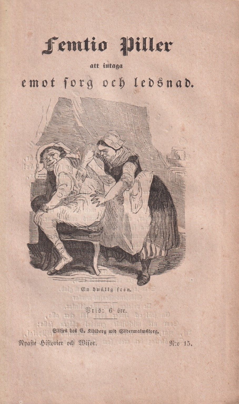 Femtio piller att intaga emot sorg och ledsnad. Säljes hos G. Kihlberg wid Södermalmstorg.