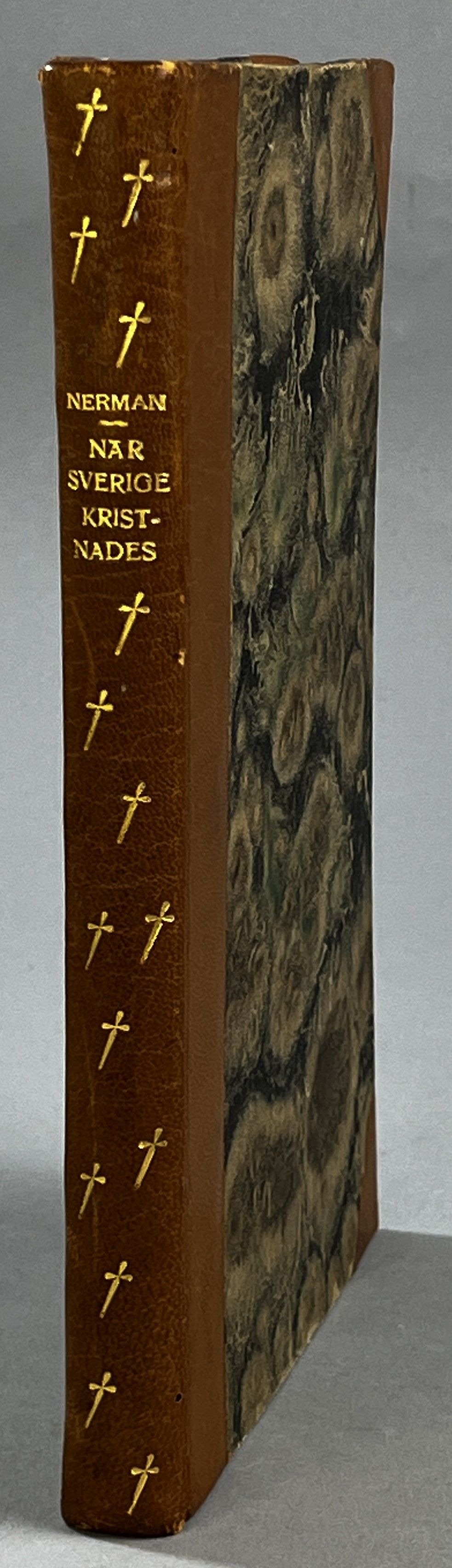 Stockholm, Ivar Hæggströms Boktryckeri, 19425. 8:o. 192 s. Illustrerad. Brunt halvskinnband (osignerat) med ryggtitel & -dekor i guld, marmorerat pärmpapper, övre guldnitt. Båda omslagen medbundna. Yttre fals med två minimala maskhål, vilka gått vidare till inre falspapper.