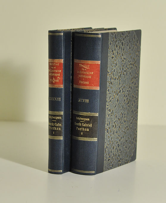 Helsingfors, 1908-11. Porträtt,XIII,(1 blank),281 s. + porträtt,VIII,573,(7) s. & plr. Två blå hklbd med guldornerade ryggar, röda serietiteletiketter respektive svarta titeletiketter, båda i skinn, och stänkta snitt. De röda etiketterna med lite repor. Med Säbylunds fideikommissbiblioteks nyare svarttryckta exlibris med fyra vapensköldar.