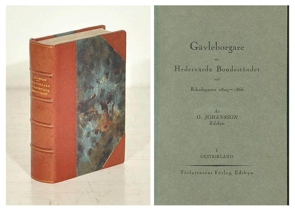 Gävle & Hudiksvall, 1929. (2),LX,126,(1) + 31 + 32-157,(2) + 146,(2) s. Fint rödbrunt halvmarokängbd med upphöjda bind, guldornerad rygg, marmorerade pärmpapper, dito snitt och medbundna främre omslag. Ryggen lätt blekt.