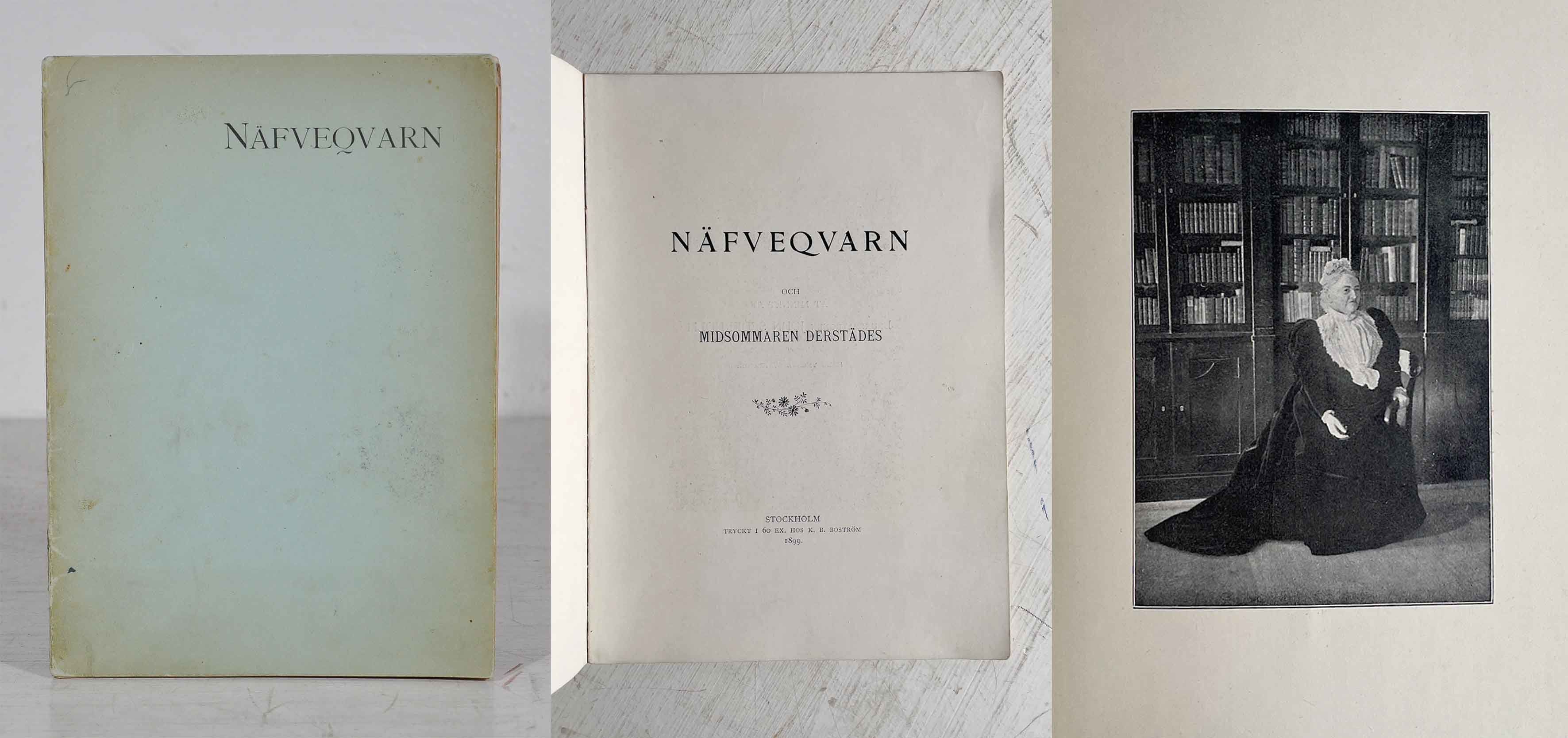 Sthlm, 1899. 30 s. & 5 plr, varav en medräknad i pagineringen. Häftad. Omslaget solkigt och skadat i ryggen. Enstaka solkfläckar i marginalerna. Ett tillägg i bläck på s. 17. Dedikation till Gösta Sederholm på försättsbladet.