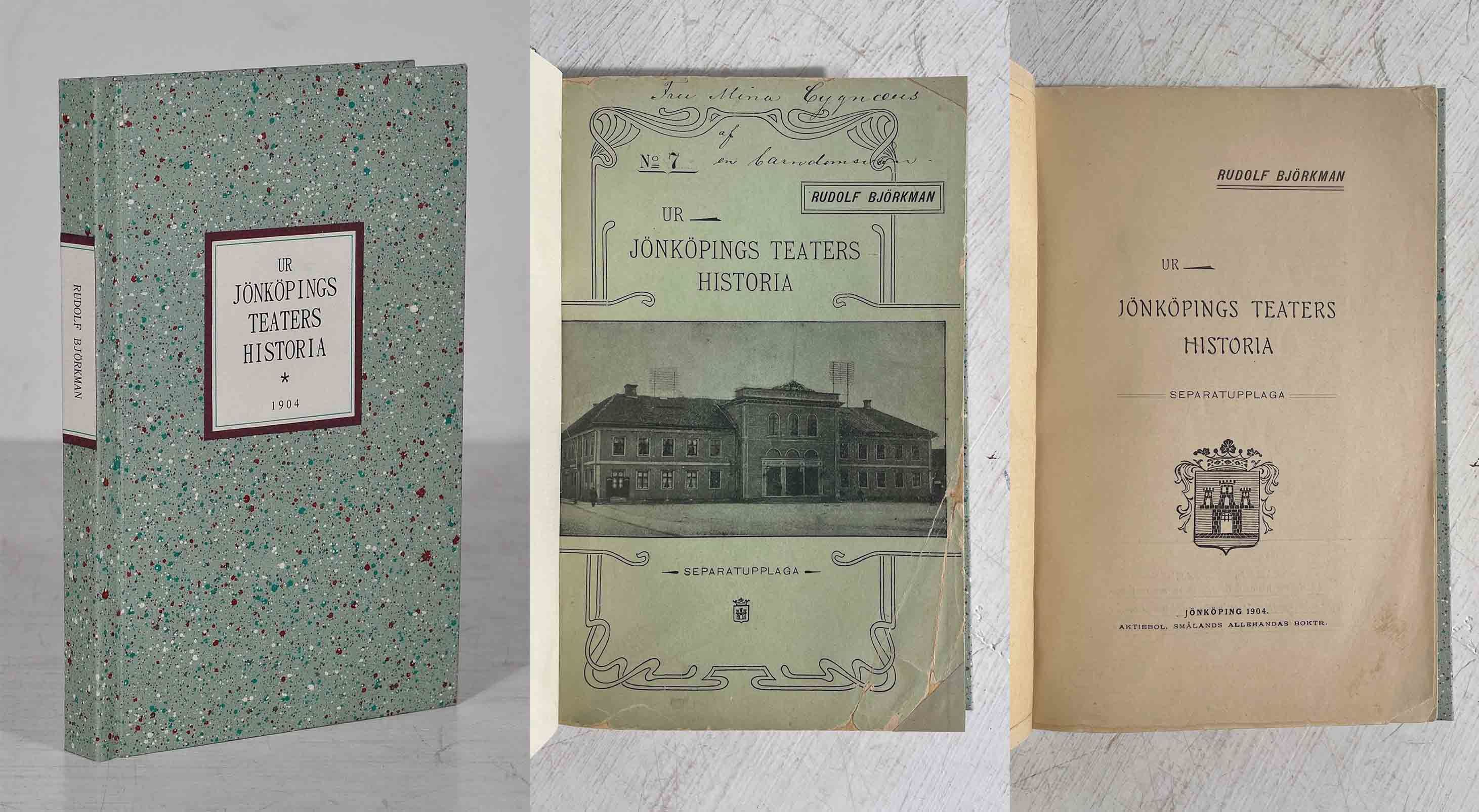 Separatupplaga på bättre papper i 50 exemplar, denna numrerad 7, av en tidningsartikelserie i ”Smålands allehanda”. Den innehåller dessutom ett tillägg om den äldre teaterhistorien i området på s. 191-216 och två extra planscher. Innehåll: ”Landsortsscenen på 1700-talet”, ”Seuerlingska sällskapet”, ”Spektakelhuset på Maden”, ”1797-1799”, ”Vid 19:de seklets början”, ”Teaterladans sista år”, ”Jönköping i början af 1800-talet”, ”Teaterhusbolaget”, ”Invigningen”, ”Djurströmska sällskapet”, ett antal kapitel om olika tidsperioder 1825-1903, ”Förr och nu”, ”Jönköpings teaterhus-aktiebolag”, ”Sista representationen”, ”Två tillfällighetsteatrar”, ”En kraft i det tysta” och ”Sceniska artister från Jönköping”. Mina Backlund Cygnæus (1851-1936) var född i Jönköping och verksam som skådespelare i Sverige och Finland. Sven Hirn (1925-2013) var finländsk bibliotekarie och kulturhistoriker med teaterhistoria som en specialitet.