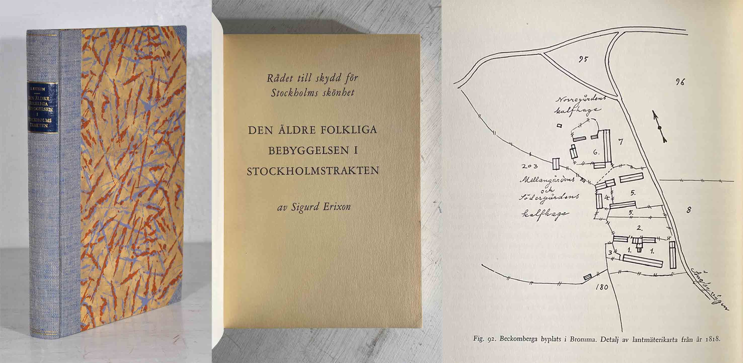 Utgiven av Rådet till skydd för Stockholms skönhet. Innehåller först en inledning och därefter kapitlen ”Tyresta by”, ”Några byar i Stockholmsområdets norra del” (Akalla, Karsvik, Nälsta och Vällingby), ”Översikt rörande bebyggelsen”, ”Bondgårdar”, ”Säteribildning och herrgårdskoncentration”, ”Torp”, ”Lägenheter och baracker”, ”Hyreshus, sommarnöjen och villor”, ”Värdshus och krogar” (i socknarna Brännkyrka, Bromma, Spånga, Salem, Botkyrka, Nacka och Solna), ”Den sociala och funktionella omvandlingen av bebyggelsen”, ”Översikt av de under 1800-talet brukade boningshustyperna”, ”Uthus”, ”Byggnadssättet och dess utveckling i allmänhet” och ”Förteckning på märkligare gårdar och byggnader”. Avslutas med ett ortsregister.