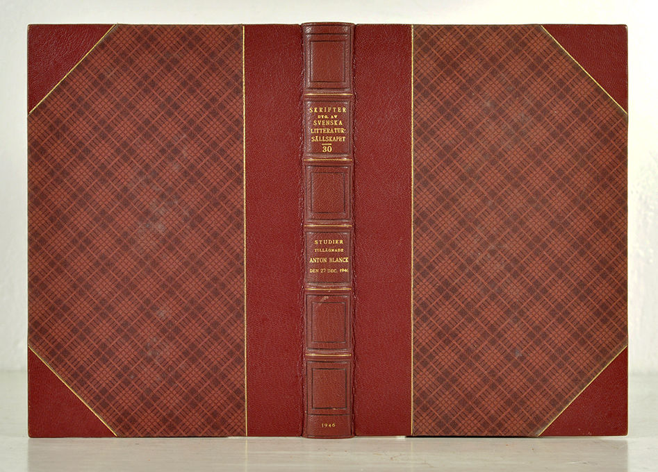 Uppsala, 1946. Porträtt,XII,373,(1) s. & 2 plr. Mörkrött halvmarokängbd med upphöjda bind, ryggdekor i guld och svart, klotpärmar med gulddekorlinjer, övre guldsnitt, övriga snitt endast putsade (Alfr. Lundin). Omslaget medbundet, det främre missfärgat på baksidan. Tidningsartikel (anmälan betitlad ”Hyllning till en lärd man” av signaturen ”H. S-m”, torsdagen den 6 februari 1947, inklistrad på två i början av boken medbundna blad. Bilagt: tidningsurklipp (understreckare av Fredrik Böök i ”Svenska dagbladet” 17-3-47 med titeln ”Svensk litteraturhistoria” samt frankerat kuvert adresserat till Nicolai Thomsen och innehållande tackkort från Blanck.