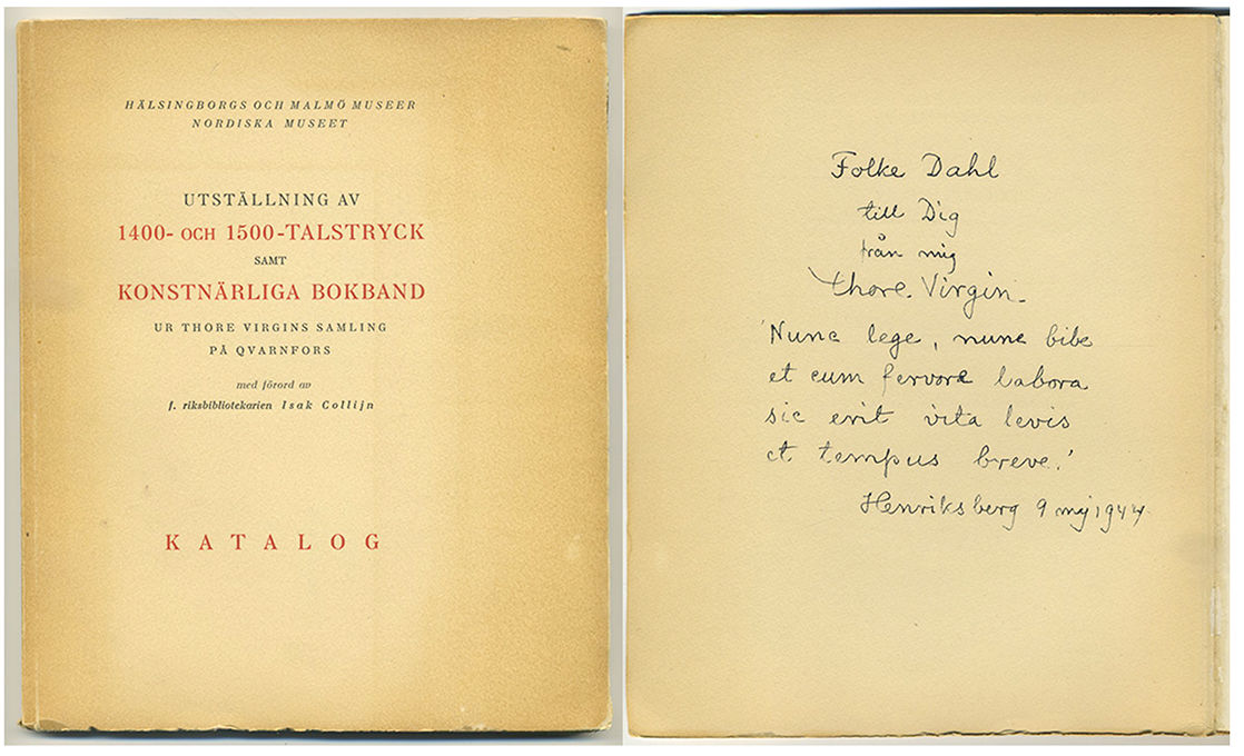 Utställning av 1400- och 1500-tals tryck samt konstnärliga bokband ur Thore Virgins samling på Qvarnfors med förord av f. riksbibliotekarien Isak Collijn. Katalog.