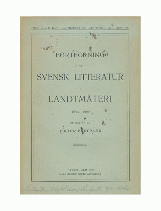 Almquist Sveriges bibliografiska litteratur 5464. Utgör årg. II, häft. 6 af Tidskrift för Landtmäteri. Aug.-sept. 1910.
