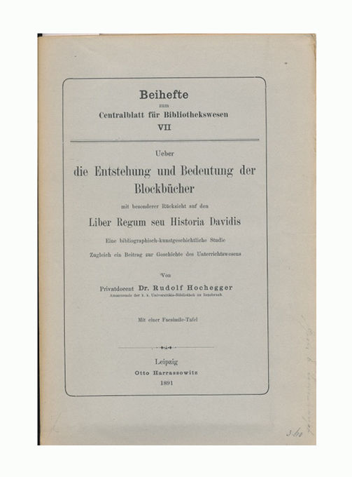 Ueber die Entstehung und Bedeutung der Blockbücher mit besonderer Rücksicht auf den Liber Regum seu Historia Davidis. Eine bibliographisch-kunstgeschichtliche Studie. Zugleich ein Beitrag zur Geschichte des Unterrichtswesens. Mit einer Facsimile-Tafel.