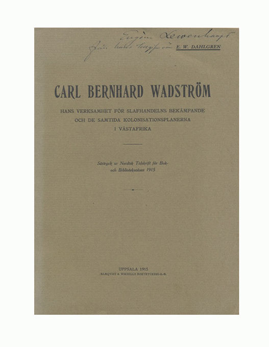 Carl Bernhard Wadström. Hans verksamhet för slafhandelns bekämpande och de samtida kolonisationsplanerna i Västafrika. Bibliografisk sammanställning. Särtryck ur Nordisk tidskrift för bok- och biblioteksväsen 1915.